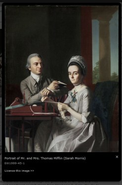 But best of all perhaps is this image, of Thomas Mifflin and his wife, Sarah Morris Mifflin, painted by Copley in 1773. Thomas Mifflin (1744-1800) and his wife, Sarah Morris Mifflin (1747?-1790), were the only Philadelphians painted by John Singleton Copley. Mifflin was an ardent patriot and by the time this portrait was made, had established himself as a successful merchant; later he rose to the rank of major general in the Continental Army, and was elected the first governor of Pennsylvania after the United States achieved independence.