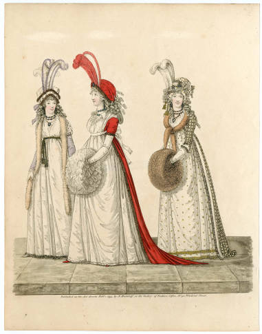 1794 and 1795 fashion plates from the V&A and the Met show similar robes, though the V&A is described as a walking dress, and the Met’s plate shows evening dress. Extant examples include the Kyoto chintz gown, and this chintz gown at the V&A.