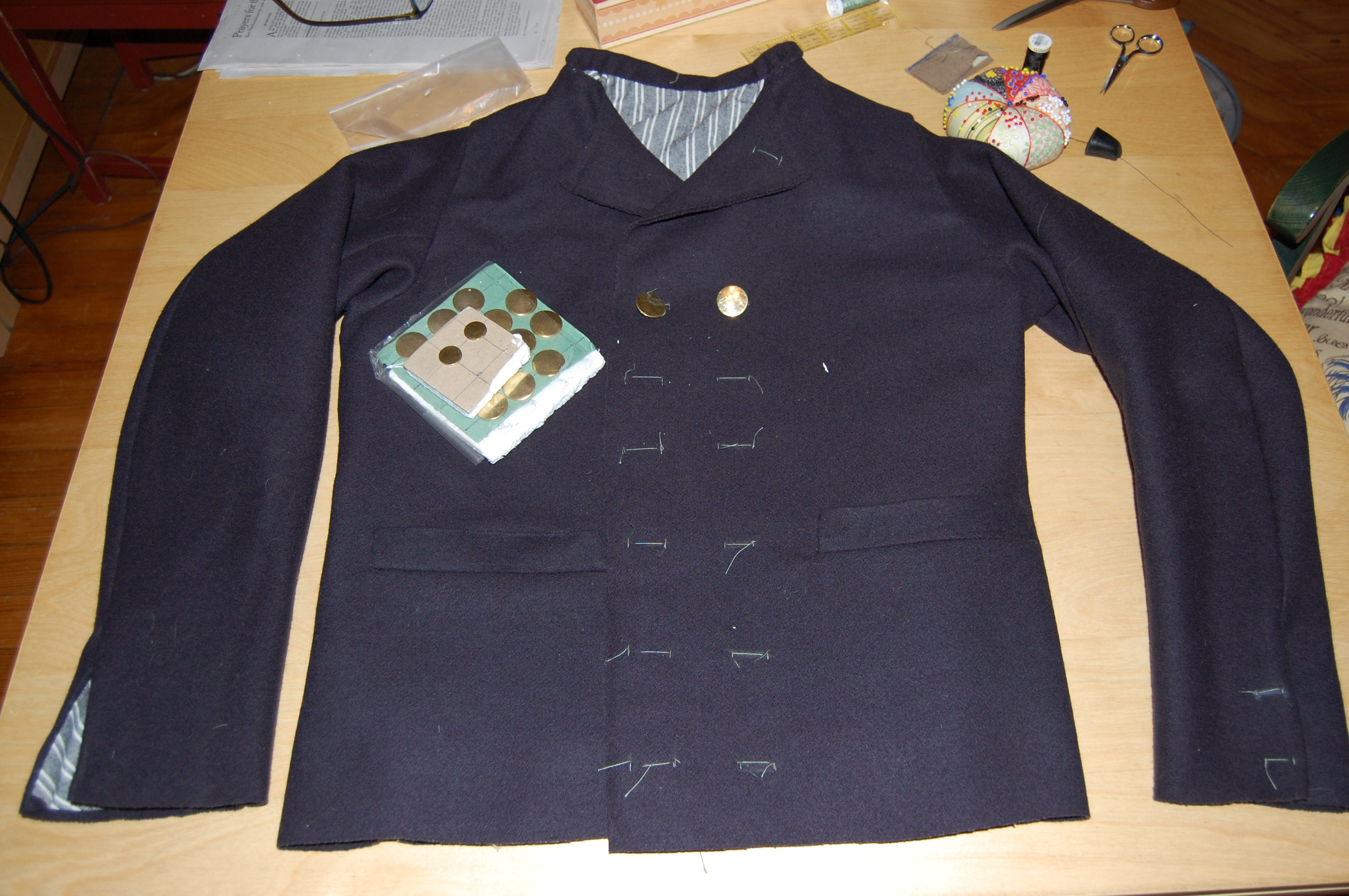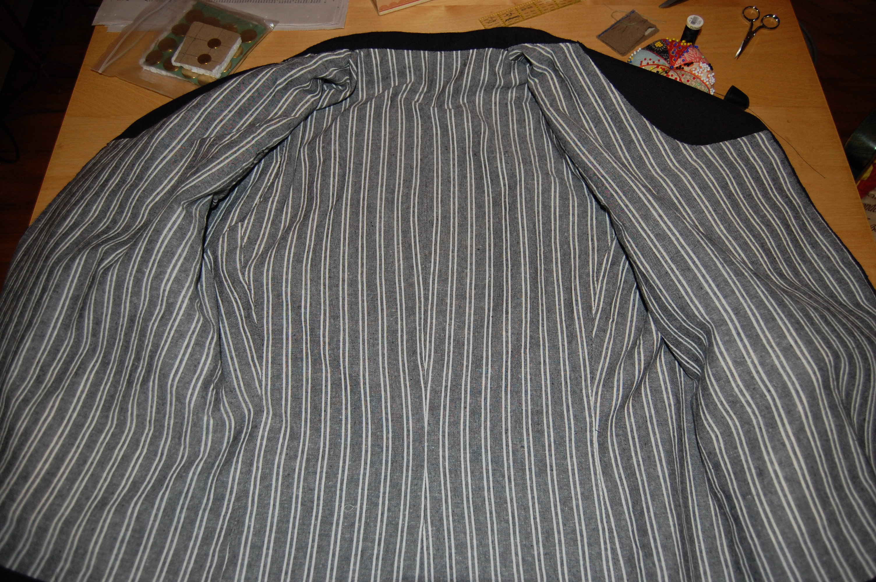 A Workman’s Jacket…not quite done. I had to work Saturday, so there went 7 hours; I got sick, I got tired, so it’s an almost, oh-so-close jacket. Buttons and buttonholes are all we lack. Of course, for a man’s jacket, that’s, you know, a significant lacking. However, I don’t want to have the crack-addled monkey buttonholes again, so I’m not doing them until I’m not rushed or distracted.