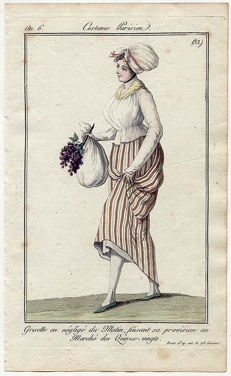 Said to be on Paris maps of 1760 and 1771, the Quinze-vingts Market was probably razed for the Rue de Rivoli. Interestingly, the major ophthalmic hospital in Paris is the Three Hundred, and there has been a Three Hundred hospital since 1260. (Sorry, Mr S: even in history, there is no escaping hospitals or eyeballs.) The neighborhood takes its name from the hospital, so Griselle is headed to her neighborhood market. You wouldn’t go far from home in négligé du matin.