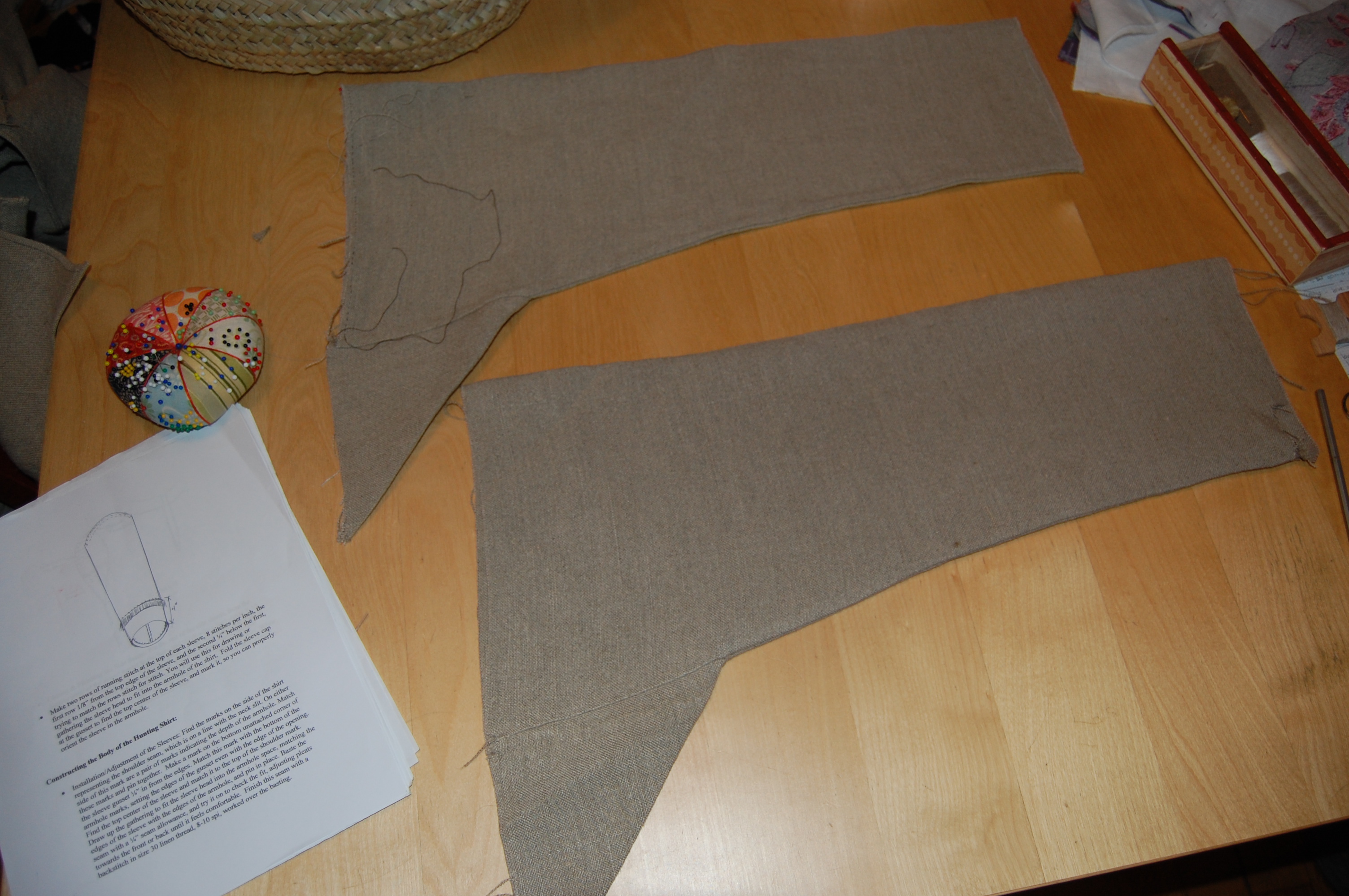 What I find hardest is fit: not only is it hard for me to judge how much to take in a garment to achieve 18th century fit while maintaining enough ease for the wearer to swing an ax (or to accommodate teenage wriggling), alterations annoy me. I suspect that the key may well be not to fit at the end of a day, but at a beginning, or at least a middle. Fitting after a long day of sewing could make you think you were tossing away a whole day of work. It also feels, still, like taking a car to the mechanic or the cat to the vet. There’s something wrong, and I don’t quite understand it. Yet. But with Shoulders Roll Forward and Monkey Arms, I bet I’ll understand more soon.