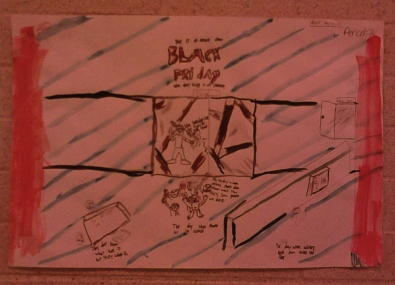 Austin, who played Toto in the fourth-grade play, took aim at consumerism and Black Friday. He likes Manga and used to play Yu-Gi-Oh with the Young Mr on the school bus. The text was hard to read even in person, but I believe there is commentary on people should be home with their families, and people don’t even know what there is to buy, but they want it. The mayhem is clear: I think this must be a drawing of the awful trampling incident. As far as I know, his parents are still a teacher’s aide and a cook, so is likely a pure expression of a basic instinct for fairness, which is probably what’s behind “$20,000 a year.”