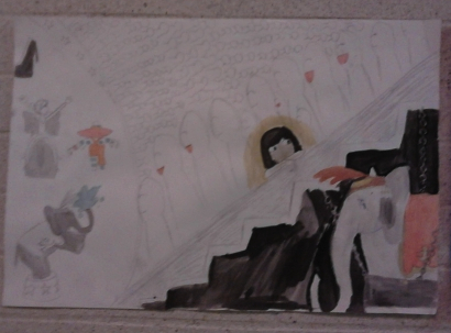This had no caption and no artist’s signature. I like the haunting, sort of Miyazaki-esque quality of the artwork (I saw a lot of manga and anime-inspired work), and I like the contrast between the light and dark areas, though it is probably not quite finished.