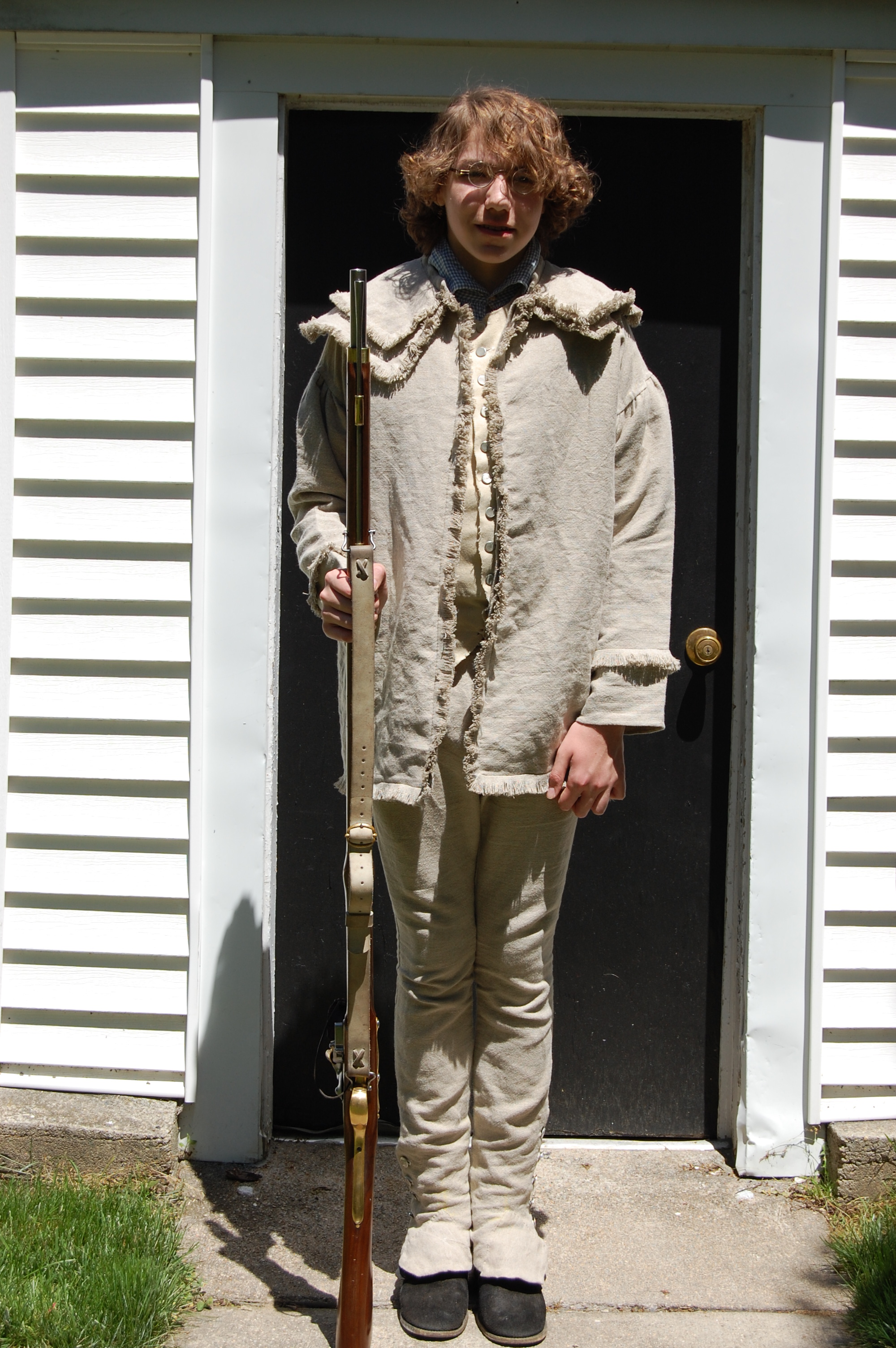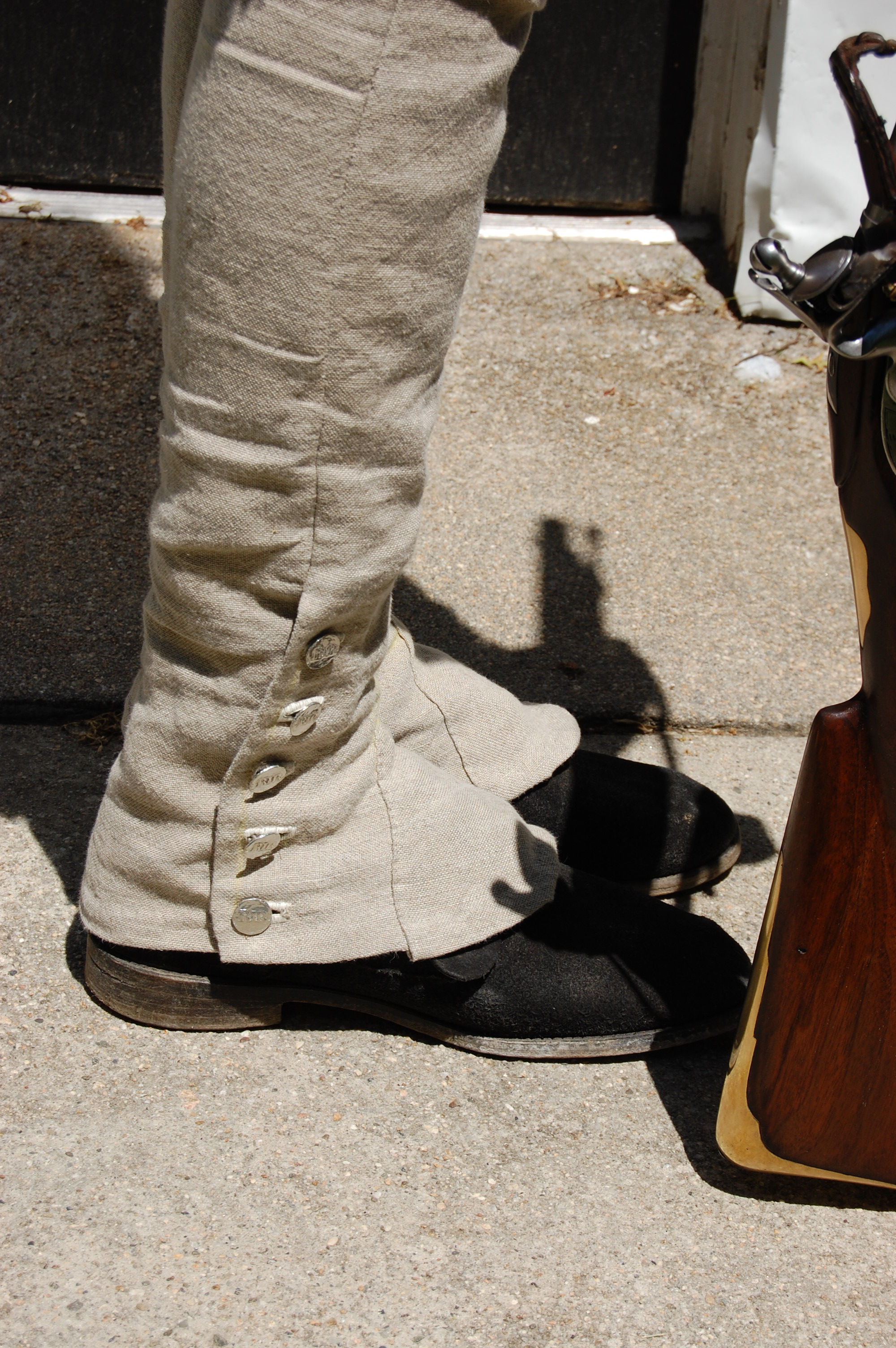 Fifteen button holes, multiple fittings, and some curse words have resulted in a pair of decent-fitting overalls that did not split at the knee or stretch too extremely when worn. And atop it all, in the yard if not in the parade, the new model hunting front adopted by the 10th Massachusetts. The Young Mr is uniform-forward as Neal Hurst’s research has led the adjutant to conclude that the men were wearing frocks, and not shirts. (In the Rhode Island records, I found that rifle frocks were listed until 1780/1781, when the Records of the State of Rhode Island began to indicate rifle or hunting “frocks or shirts.” That’s a wrinkle for Mr Hurst, but I saw only frock in 1777-1780.)
