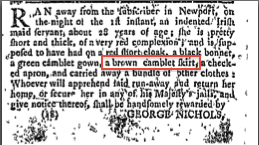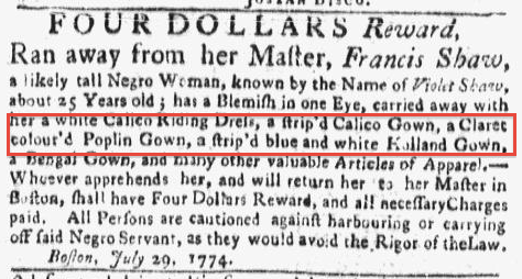 Two years later, “ a likely tall Negro Woman, known by the name of Violet Shaw, about 25 years old; has a Blemish in one Eye, carried away with her a white Calico Riding Dress, a strip’d Calico Gown, a claret colour’d Poplin Gown, a strip’d blue and white Holland Gown, a Bengal Gown, and many other value Articles…” Boston Evening Post, 8-1-1774