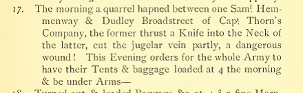 In Hitchcock’s diary, I found an account of a quarrel near Stillwater, NY on September 17, 1777. This was intramural knife-thrusting, but clearly, the 10th Massachusetts were very busy men.