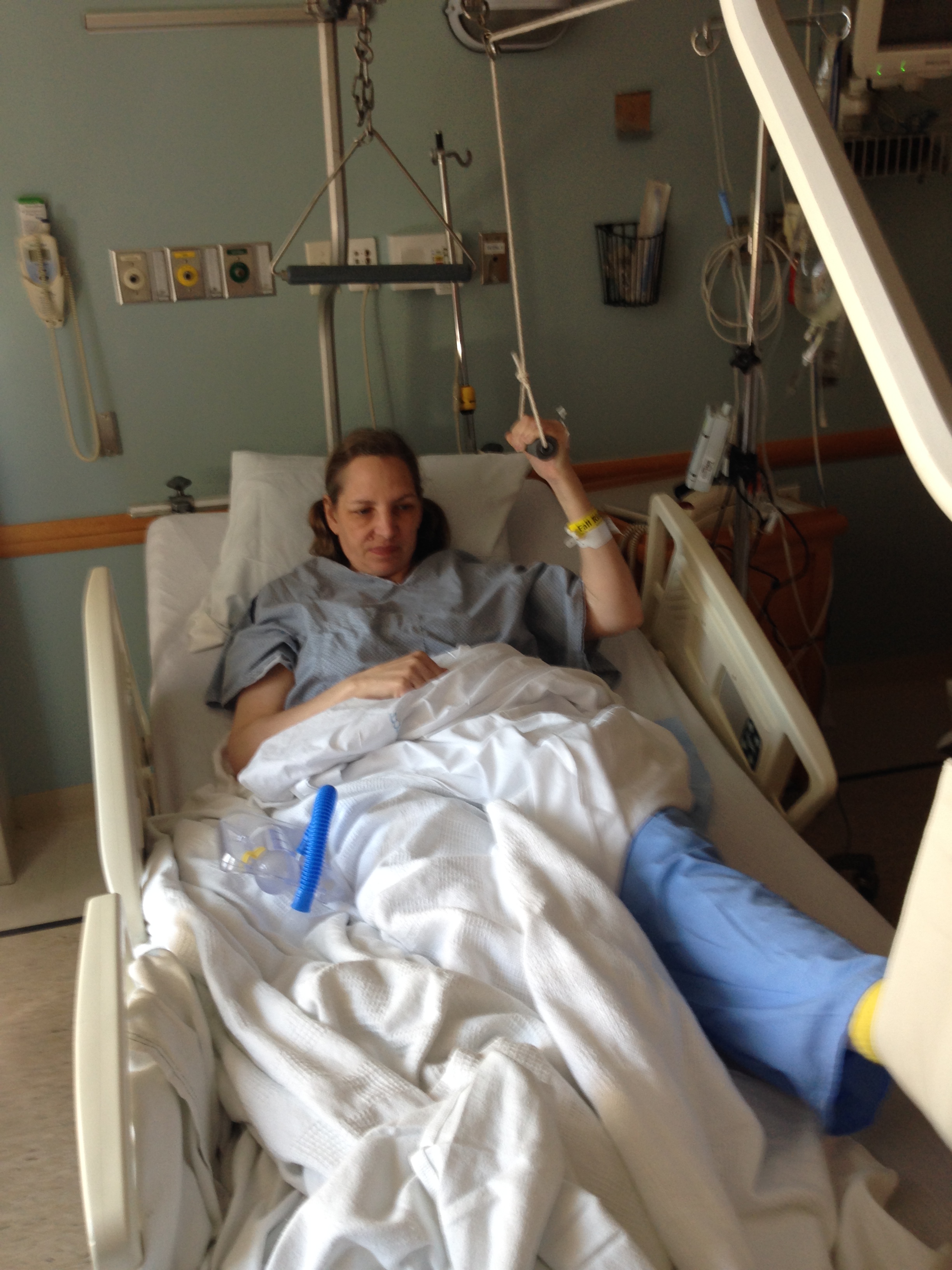 There’s a lot of time spent on physical therapy, reminding muscles that they’re just fine, and can wake up now. In the hospital, you are provided with a trapeze to lift your leg and encouraged to move it about. While oddly old-fashioned, and seemingly borrowed from Foyle’s War, it does work. I can’t slide my leg back-and-forth on the bed, but I can move if someone holds it up just a little bit. (The socks they give you are color coded: yellow is fall risk. I called them duckling feet, and the nurses were entertained.)