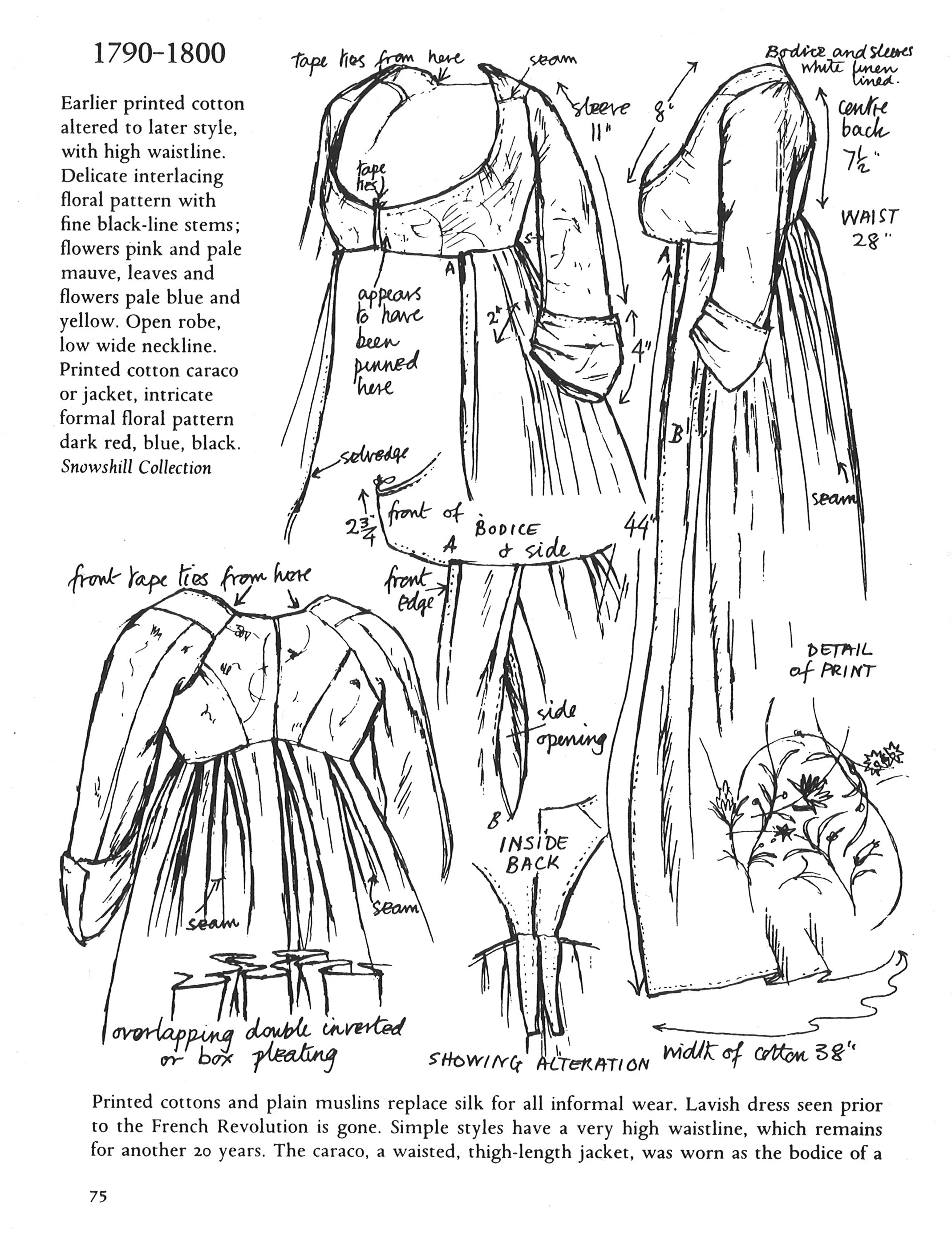 I’m particularly fond of the pleats used for the gown shown on page 75 of Nancy Bradfield’s Costume in Detail. I’ve used this as a guide several times, and I am very pleased with the results. They do vary, of course, depending on fabric weight, fibre, and length. Stiffer cottons, like the Waverly Felicity of the curtain-along gown, will make a round shape; tropical weight wool does fairly well, also, but the most amazing 1790s rendition I have achieved to date is the light-weight India print cotton short gown.