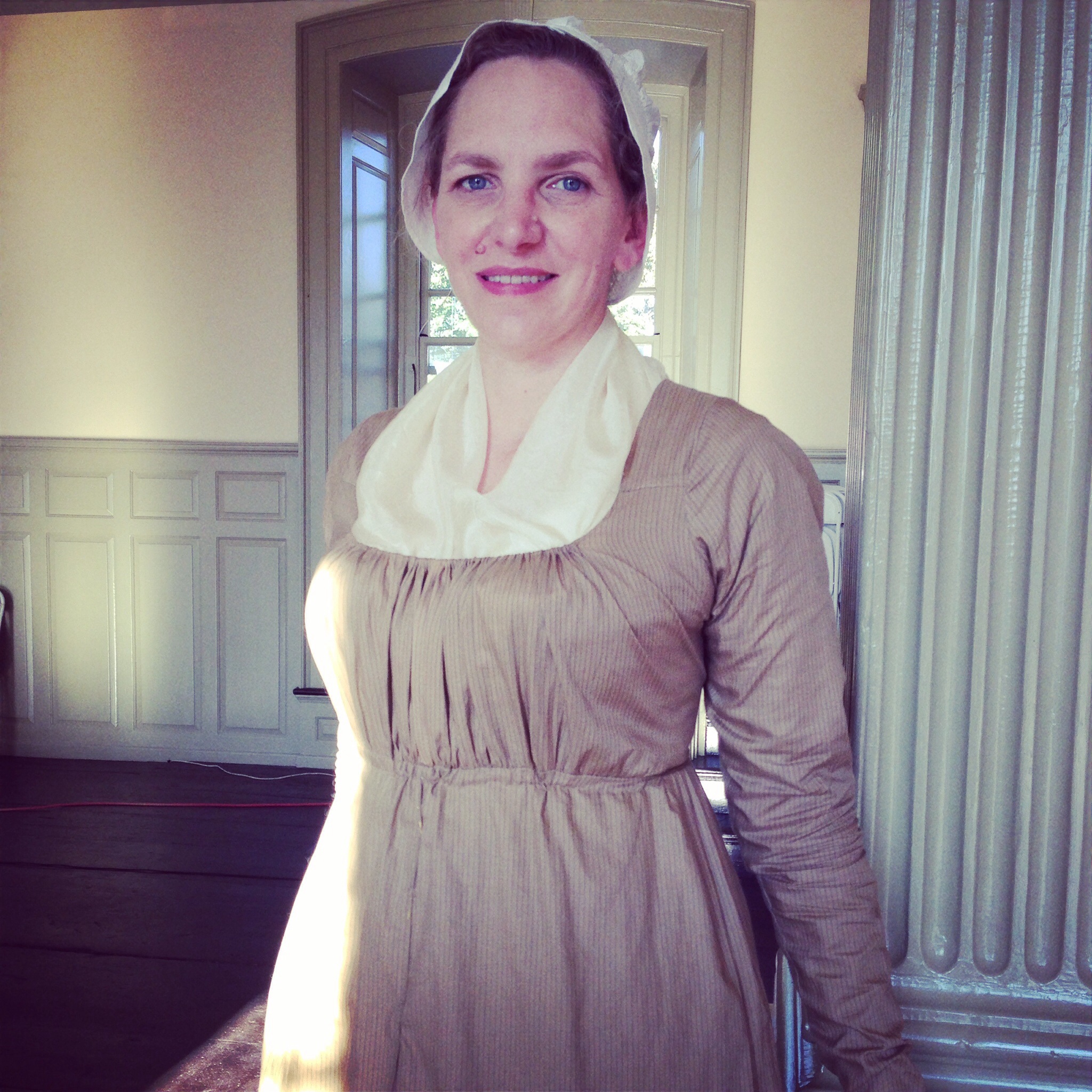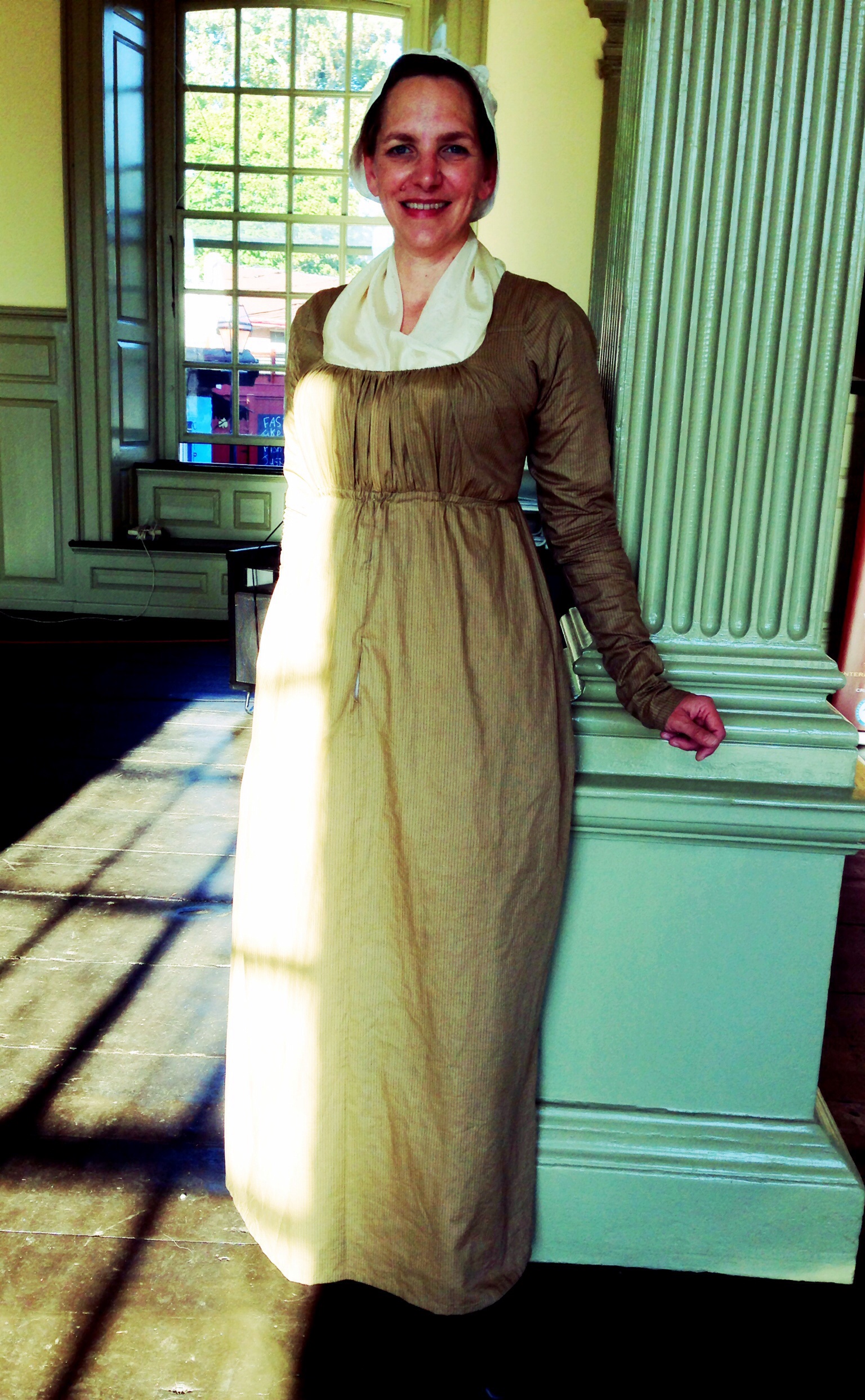 Last Thursday, we did a reprise of the Williams family letters program at the Newport Historical Society. The Williams family were Quakers, and the letters were from the early part of the 19th century, so for the program in March, I made a green silk cross-front gown based on the Quaker gown in the back of Costume in Detail. (Check out the schematic on the 19thus.come page; I didn’t see this until I was mostly done with the dress, but thank goodness I got it right!)
