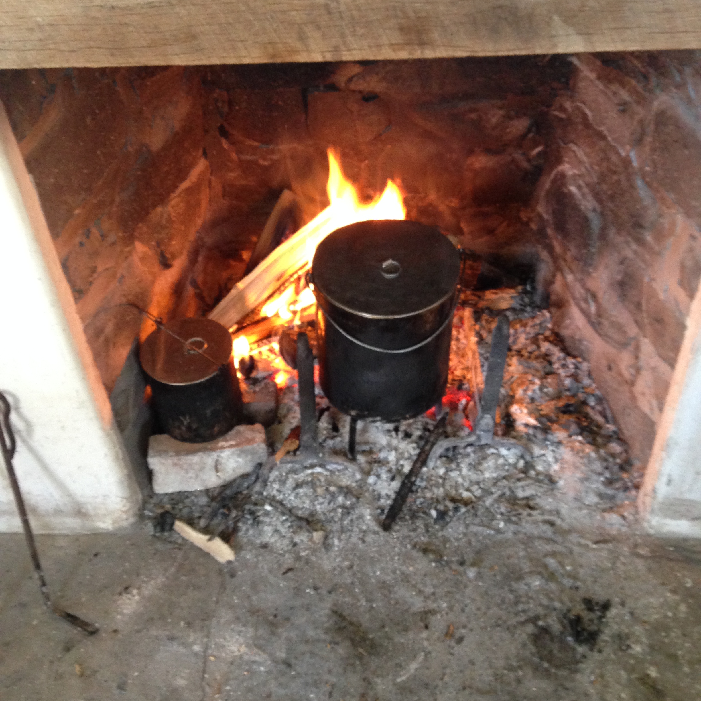 This year, we brought the only iron we own, a small trivet-like stand to put the big kettle on; the little one went on bricks from the Temple’s other fireplace. Was that slim piece of iron wrong? Probably, but in a place where we can’t dig a kitchen or make a fire outdoors, we compromised in the name of keeping supper unspilled.