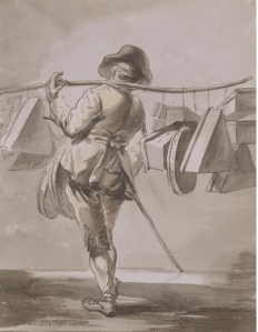 So what to do? Petty sutlery is much on my mind, for I have need of the money and a habit of making things. Lately, i’ve been band-boxing, so I was delighted to find the Huntington had digitized this Sandby drawing of a band-box seller, placing the trade firmly in the middle of the 18th century. Triangular boxes for cocked hats, circular boxes for bergeres, rectangular boxes for gloves and (neck)handkerchiefs, I presume.