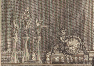 What else is on the mantle? A clock, undoubtedly ormolu– though it could be much worse. And yes, the cupid on the clock has meaning in this print.