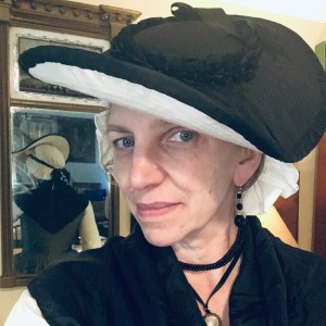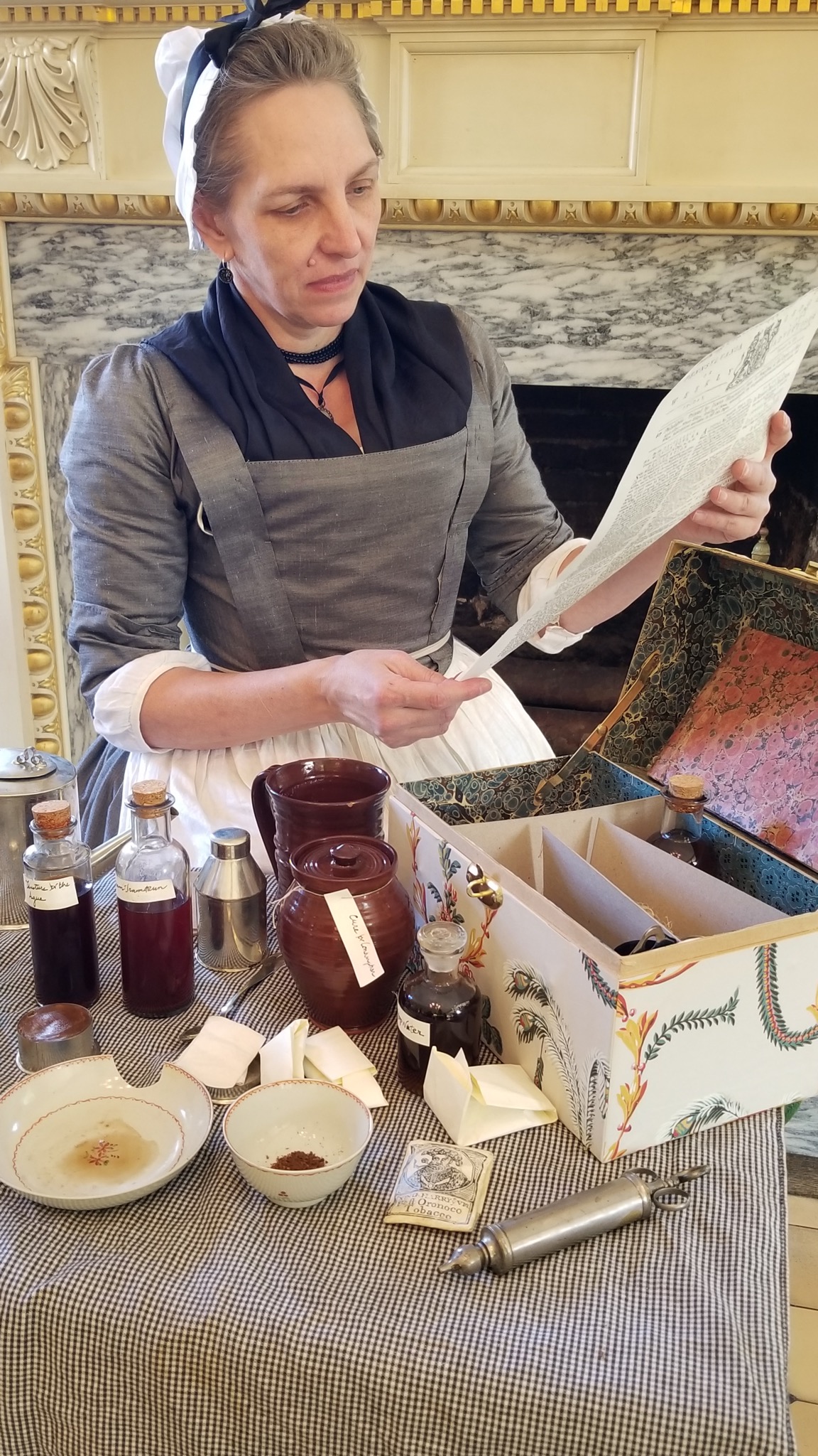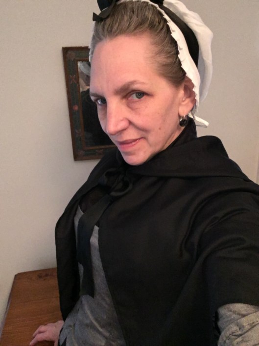 There are, as always, things I’d like to change about this presentation. Although I’d like to work on it enough to be more comfortable in first person, I’d miss the third-person ability to refer to 1849 cholera maps and general epidemiology. I definitely need to add a couple inches to the hem of the gown, up my cap game, and trim the mantelet. I’d like to find a wooden box, and add a proper mortar and pestle to the kit– my stainless steel one is perfect for home, but won’t work in public. But on the whole, I’m pleased to have an impression of a woman roughly my age, who can interact well with a character roughly Drunk Tailor’s age. Onward to refinements.