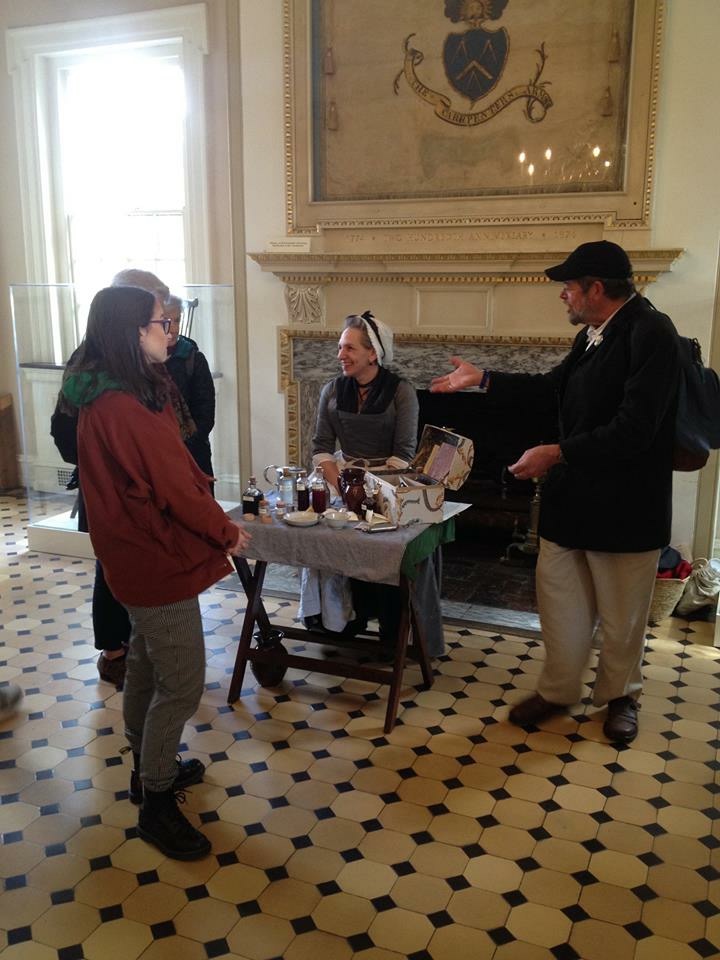 Drunk Tailor used the relationship between Thomas Nevell and Elizabeth Weed (their third marriage each) to move people around the main room of Carpenters Hall, and to some comic, as well as interpretive, effect. It’s far easier for him to say, “Six months in, six months left, of her mourning” as a means of explaining the grey and black palette of my clothes, allowing me to avoid the “You look like you’re ready for Thanksgiving!” lead in from the public. Confiding in the public that he’s had his eye on me for while lets them in on a secret, and visitors enjoyed trotting over to warn me about his interest, and that’s he’s sold his tools! I am always happy to tell them he’s just the kind of man my mother warned me about, adapting a banter we have used in multiple scenarios. While it’s broad, and nothing like how we really are together, it’s playful enough to engage the public, relax them, and get them comfortable asking questions.