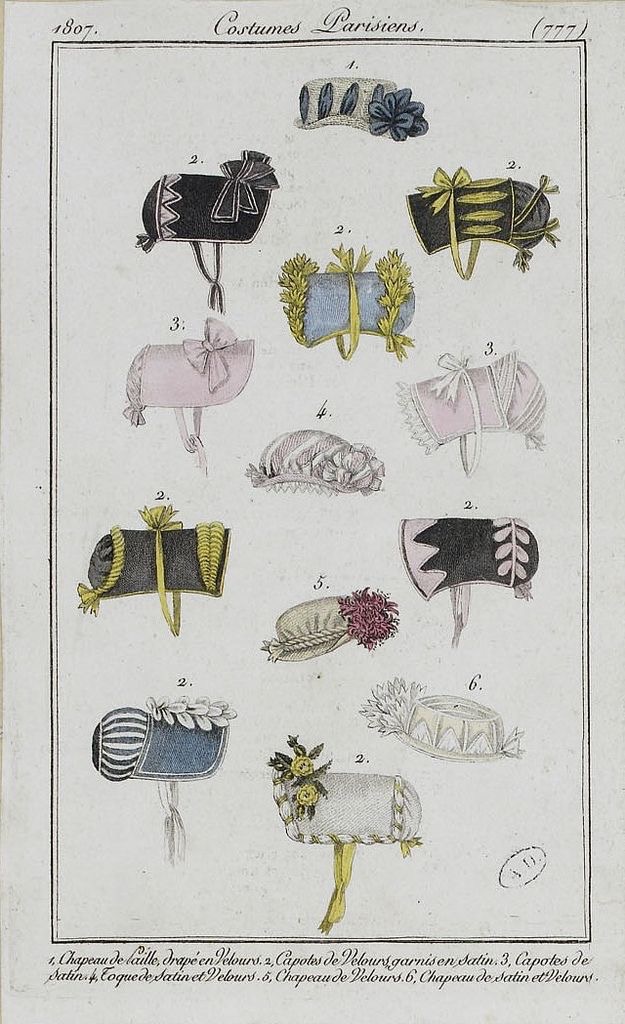 This plate has stuck with me for years: those mailbox shapes, in velour! In 1807, velour was not what we think of today (and I don’t mean Zapp Branigan). Valerie Cumming’s Dictionary of Fashion defines velour as “Wool or wool mixture cloth, soft and smooth with a closely-cut pile or nap resembling velvet.” Not having access to wool velour in the scrap bins at work, or in the fashion aisles at the local fabric store, I opted for velvet; the scrap bin provided pink silk taffeta, which I thought made a nice contrast to the texture and finish of the velvet. It is true that “velure” dates to the 17th century, and describes imitation velvet. The wool velour I’m familiar with from upholstery is too dense and heavy to drape well over a bonnet (it’s really made for sofas and armchairs), so erring on the hand of the fabric seemed a reasonable choice. Wool velour with silk satin would be an amazing textural contrast, but with this color combination, almost any fabrics will give a pleasant optical shock.