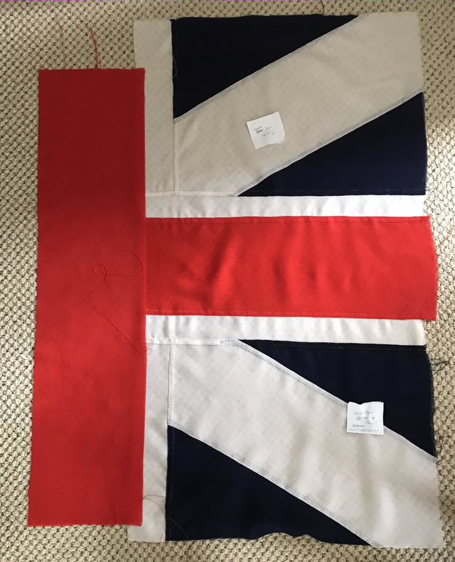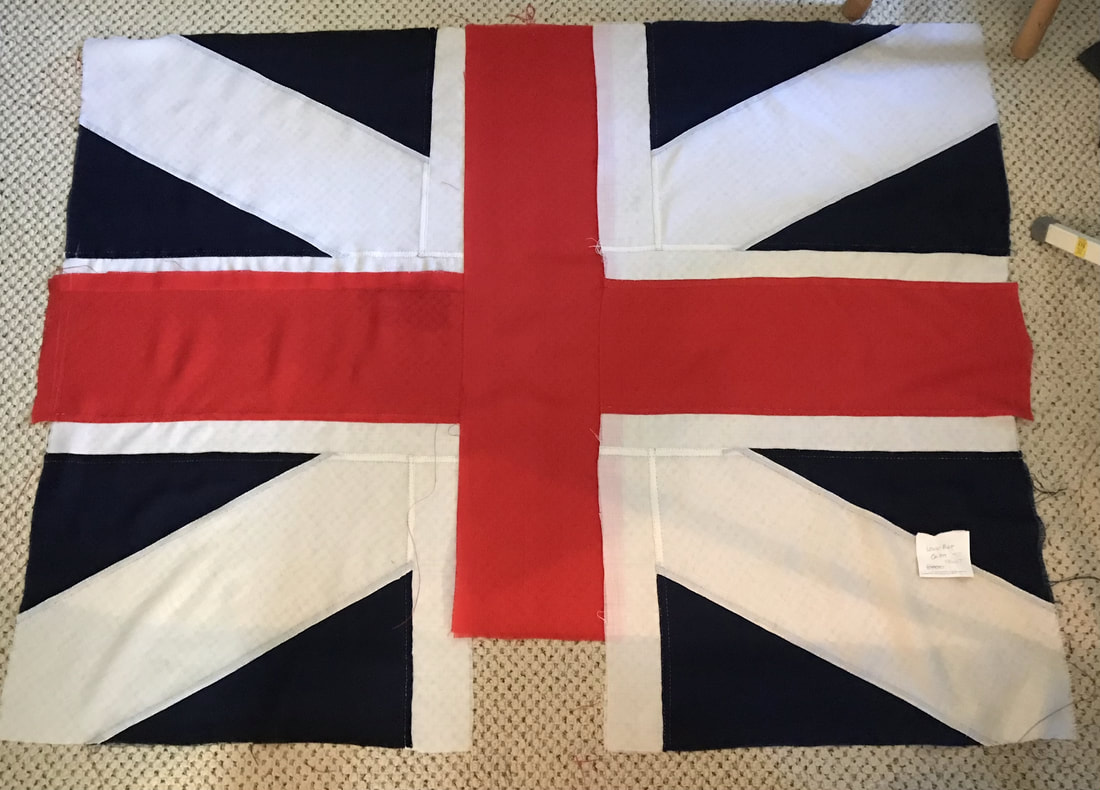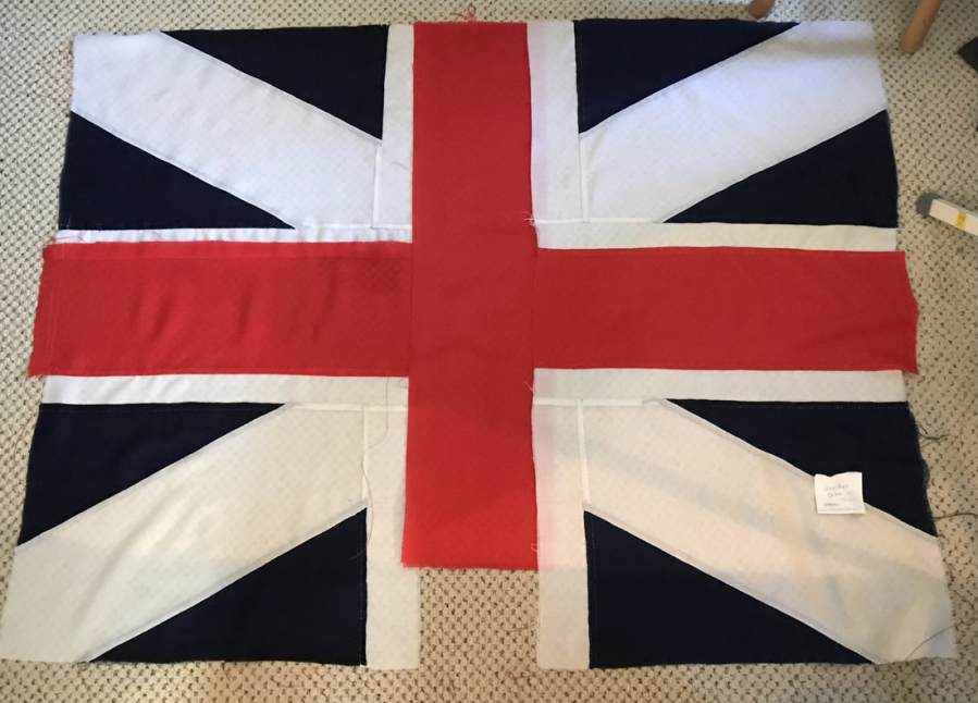 Once the four corners of the canton are assembled, they need to be stitched to the horizontal and vertical bars. This is a straightforward task, but worth double checking. I pinned and matched the pieces to be sure that the horizontals would be the same length as the blue and white rectangles, and then checked the two sides against each other. The pieces aren’t always precisely even: the loose weave of the wool, the pull of the stitches, and the generous seam allowance can distort the pieces a bit as I work.