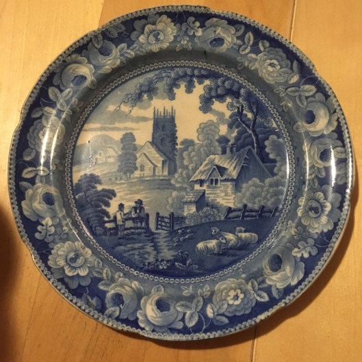 In the photo at left, the coffee pot on the mantle is now in a museum collection, as are the miniatures, the bellows, and the pipe box (which is now on display in a historic house museum). What my eldest friend gave me is not in the image of the house, but resembles the plate to the left of the fireplace: a Staffordshire transferware “Village Church” pattern plate with a wild rose border, ca 1825.