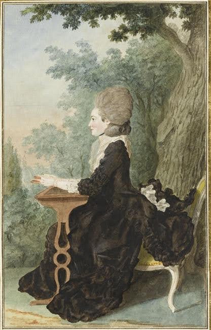 The inspiration was a watercolor drawing by Louis Carrogis of a woman in a black or dark grey gown. Back in 2019, I think I was thinking of a polonaise for a widow, but I don’t recall. In any case, there it was: dark grey silk. Off we went.