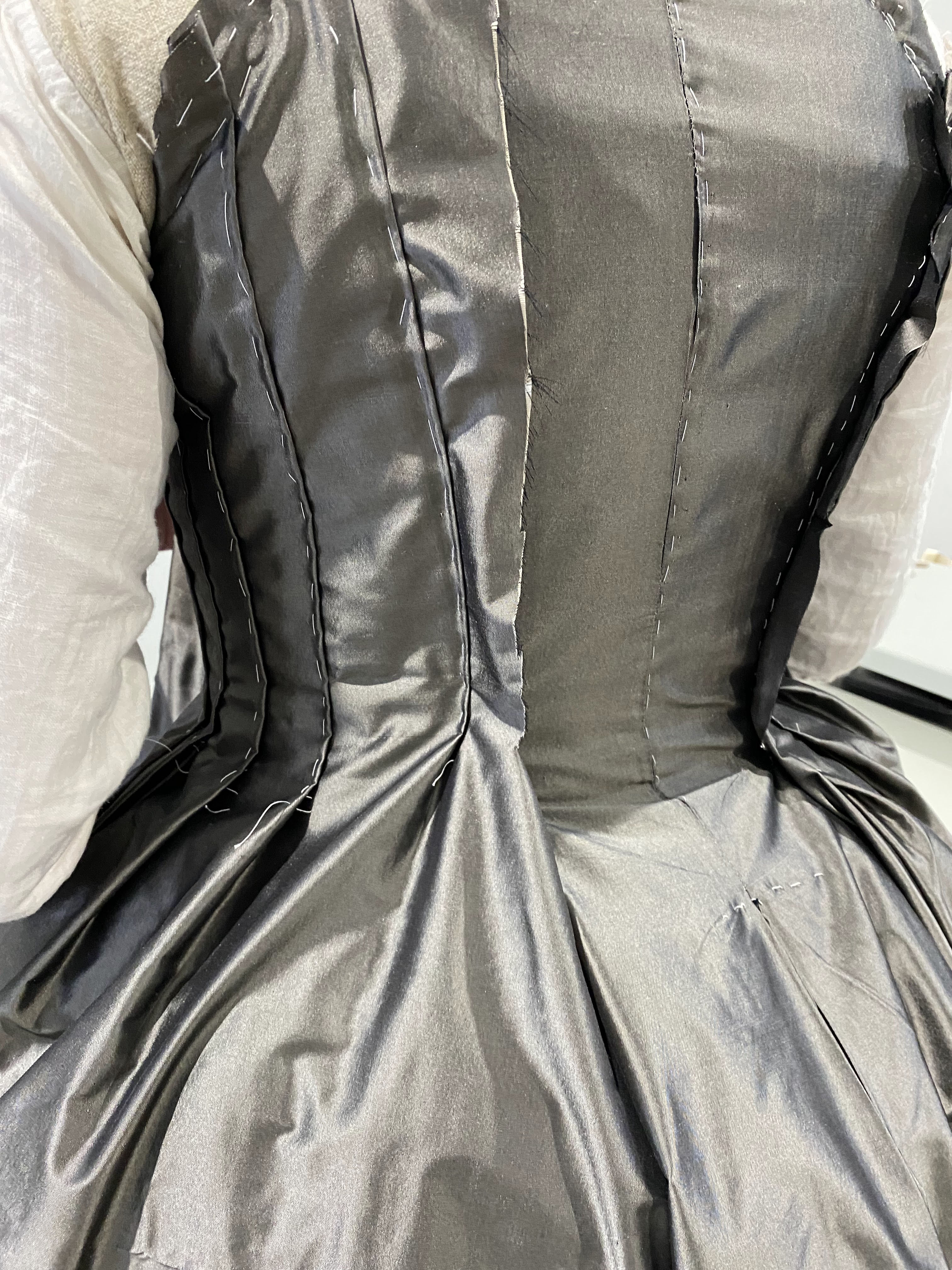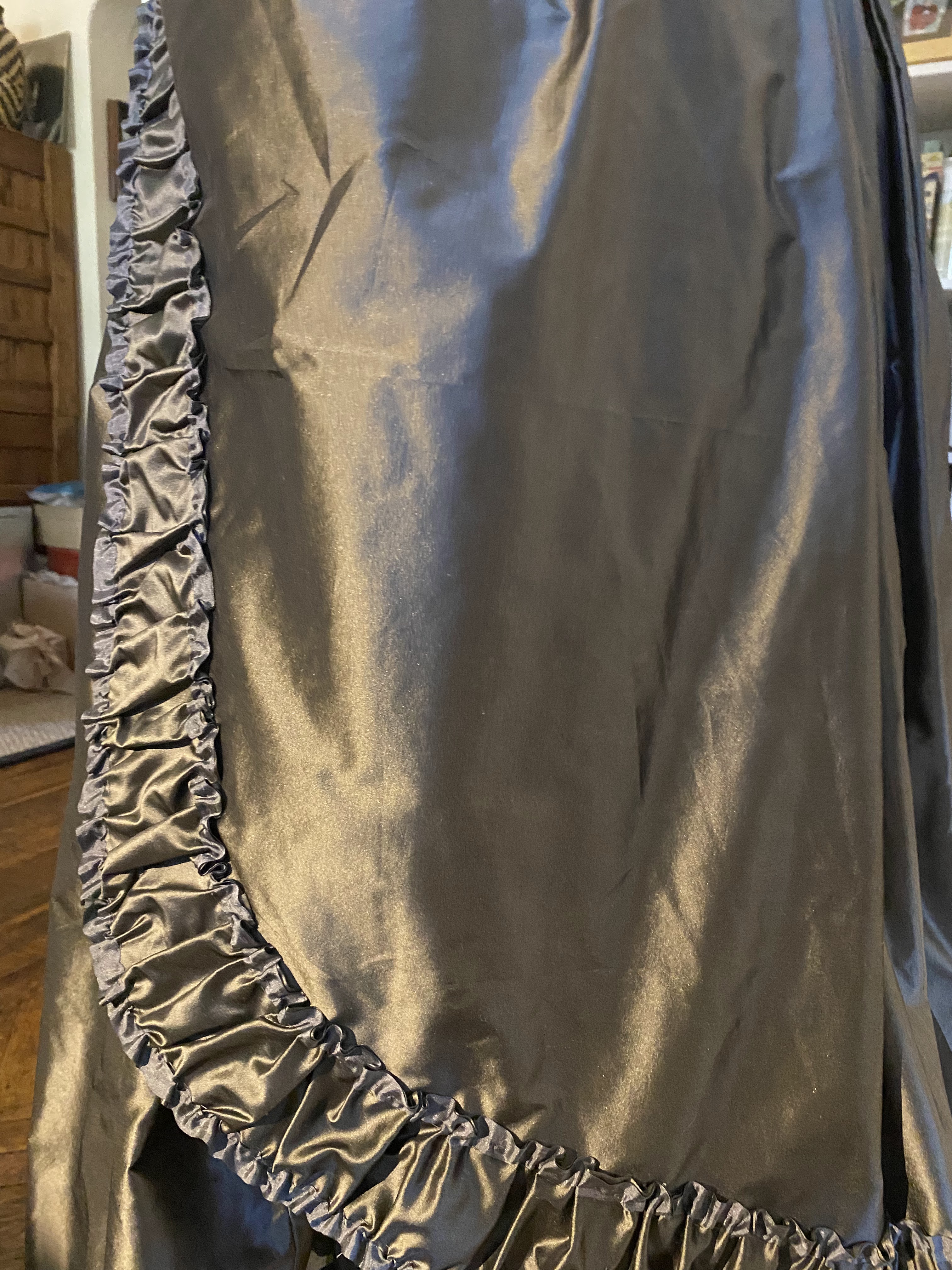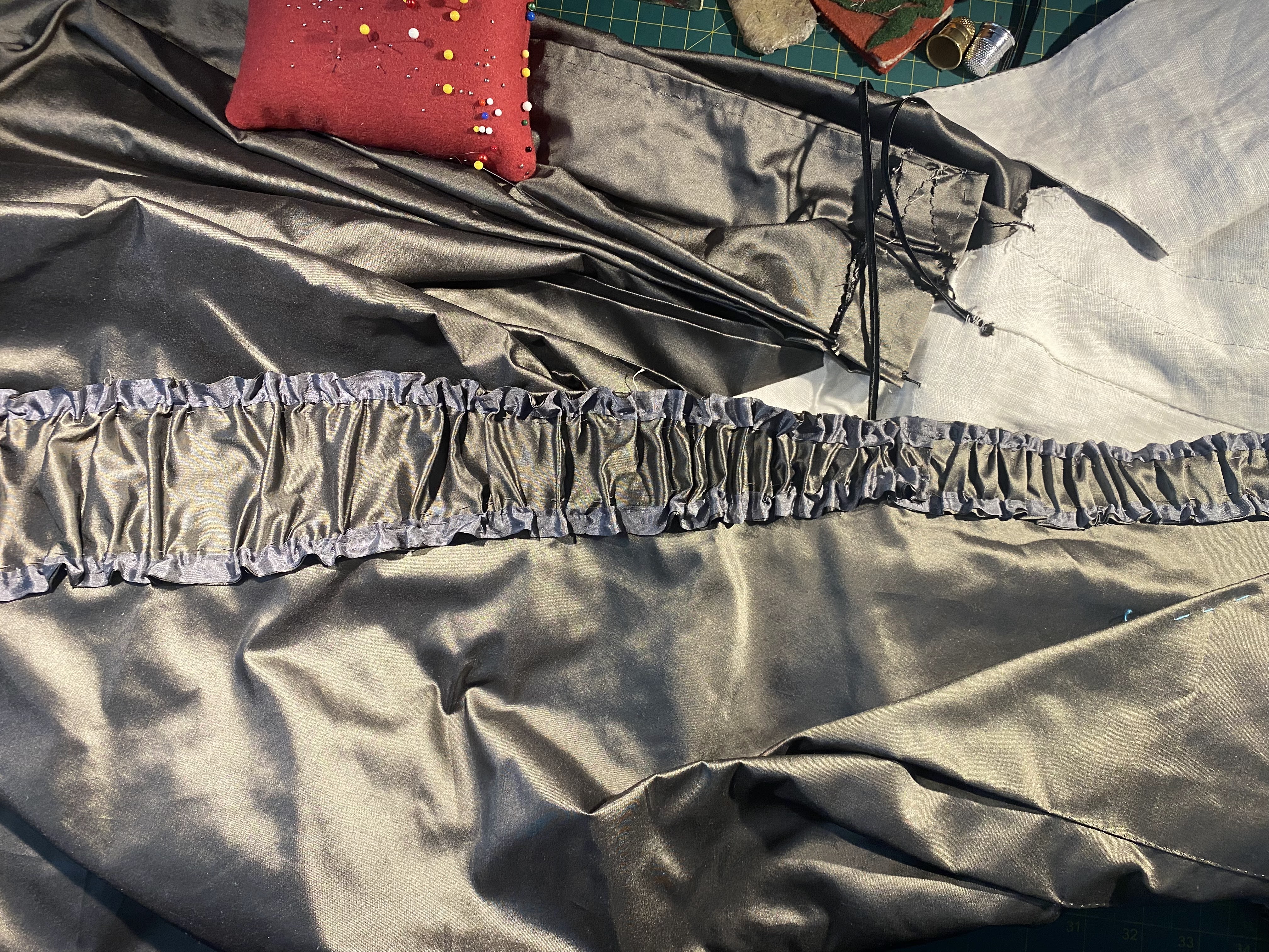 Stitching the side pleats was straightforward, and satisfying as the gown began to take the polonaise shape. Once the side bodice seams are set, the skirt seams can be stitched (you would’ve basted them already). Then you can start working on the buttons and cords that control the pouf of the skirts.