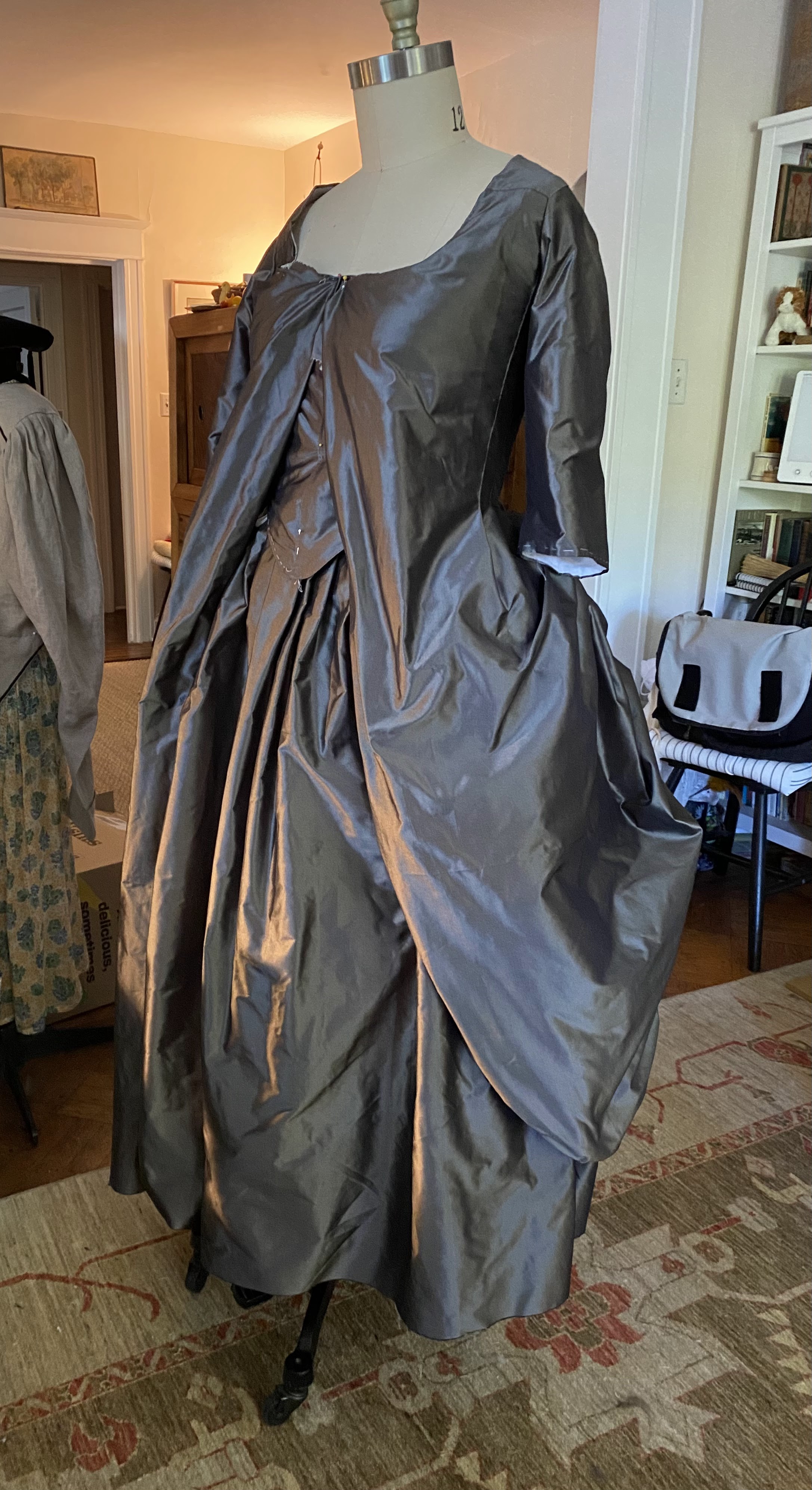 The other thing to know is that these appear earlier than we sometimes think. In the 1771 Louis Carrogis watercolor, both Mmes les Comtesses de Fitz-James et du Nolestin wear polonaise gowns (right). In the English world, the May 1775 Lady’s Magazine describes “nightgowns in the French jacket fashion, flying back, and tying behind with large bunches of ribbons.” (Ladies Dress for May,” 235. (1775). Despise these early references, we know the polonaise is not taking New England by storm, but it does appear in Philadelphia by 1778. This put the form within my interpretive range, so I felt more comfortable tackling the gown: I knew I would have a place to wear it. (What I will do with the redingote underway or the polonaise à coqueluchon I crave remains to be seen; at least the polonaise hoodie is a plausible stretch for Philadelphia.)