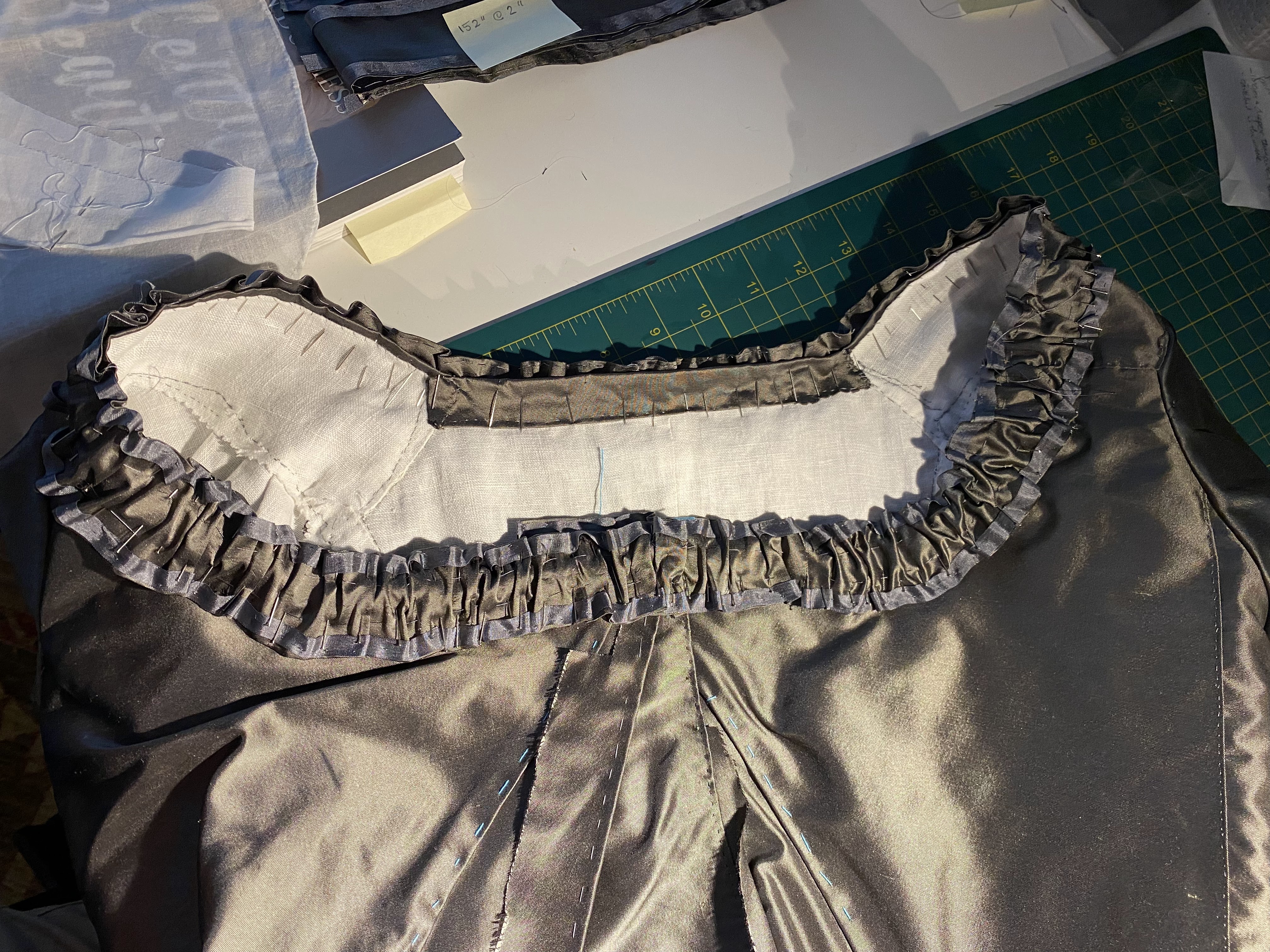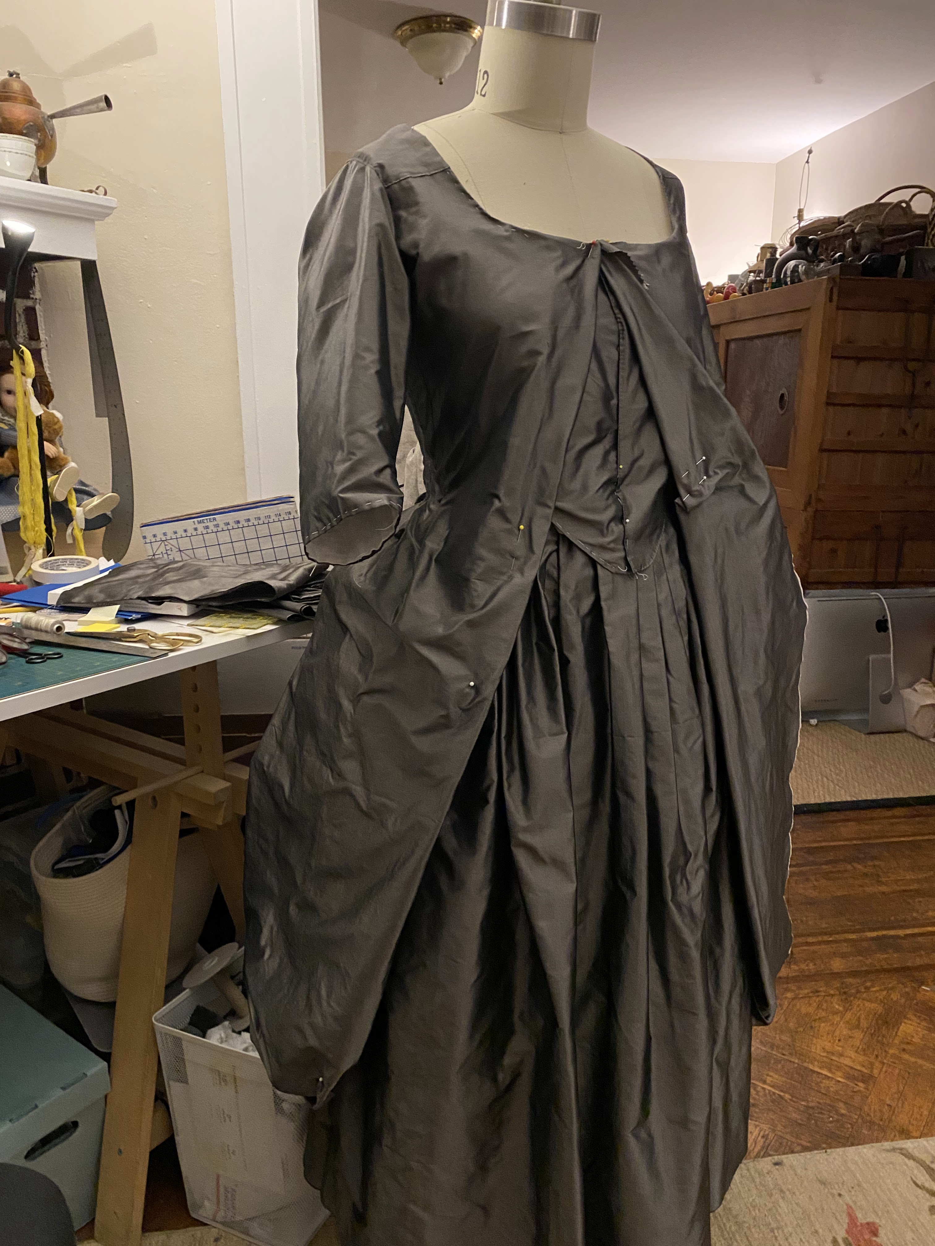 Starting with basic shapes from the last B&T pre-pandemic workshop, updated to reflect the rollercoaster of pandemic weight and tweaked yet again, I cut the backs and stitched the center back seam. The front bodice shape is cut wider, and in one piece with the skirts, as it will be pleated to fit the body. The fullness of the skirts ends up pleated at the side and back seams much the way a man’s coat skirts are pleated, only more generously. So the body of the gown is cut from four main pieces (two fronts, two backs) along with the sleeves and sleeve straps. That’s it. In some ways, this is a simpler form than the English gown, though the fitting feels trickier because it’s not happening in vertical back pleats that many of us default to. It is a gown best made to you by someone else (hence the workshop) or by you on a well-fitted mannequin.