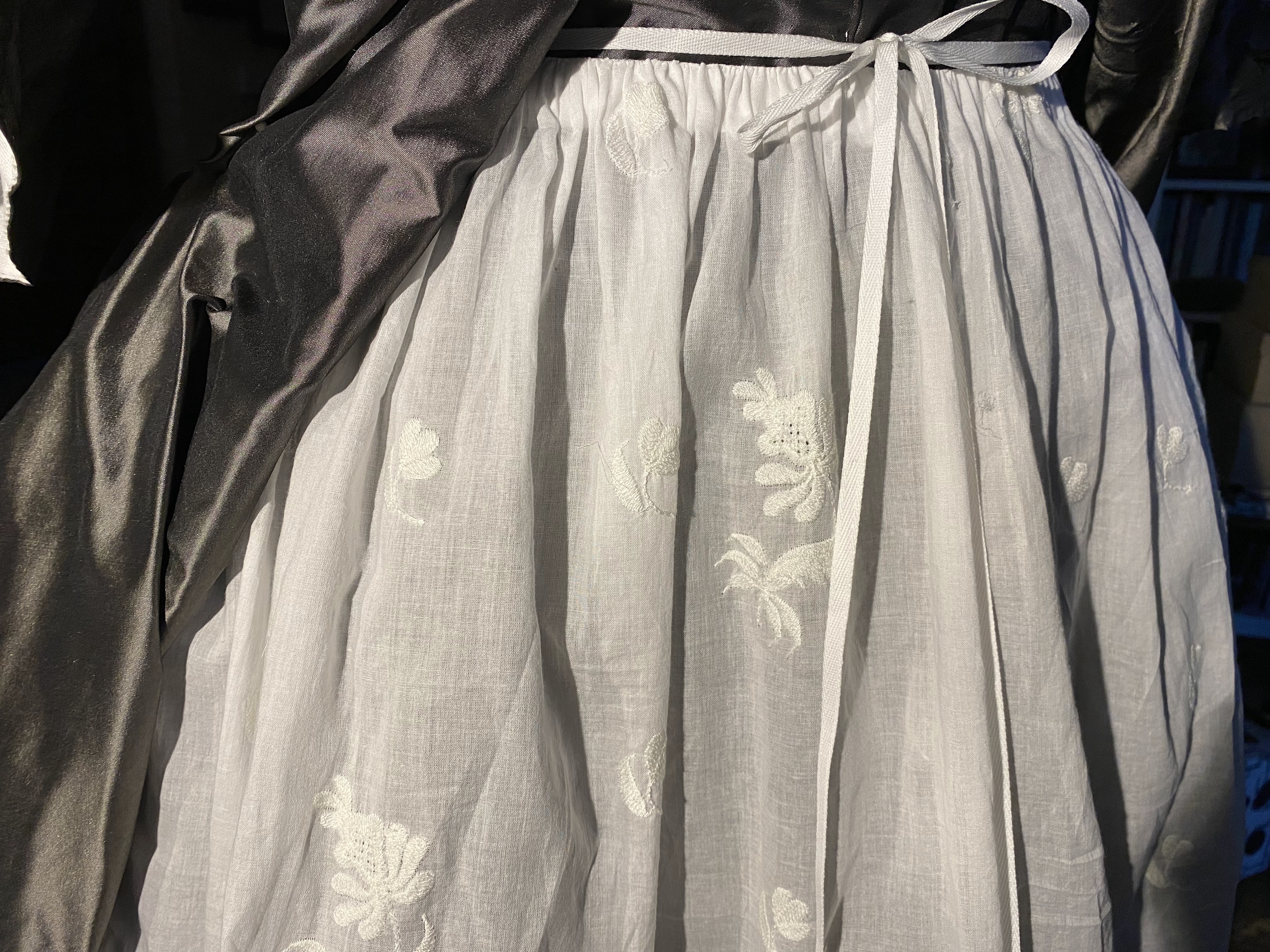 Sprigged muslin or lawn was a common apron fabric for the decorative aprons worn by the better sorts and seemed appropriate to my milliner. She needed to be fancy but practical since I was imagining this ensemble as comfortable but fashionable workwear. Is there a 21st-century analog? The 20th-century analog for polonaises might be the velour Juicy Couture tracksuits a certain kind of upper-middle-class woman wore to go shopping with friends on a Saturday: expensive, trendy, and comfortable.
