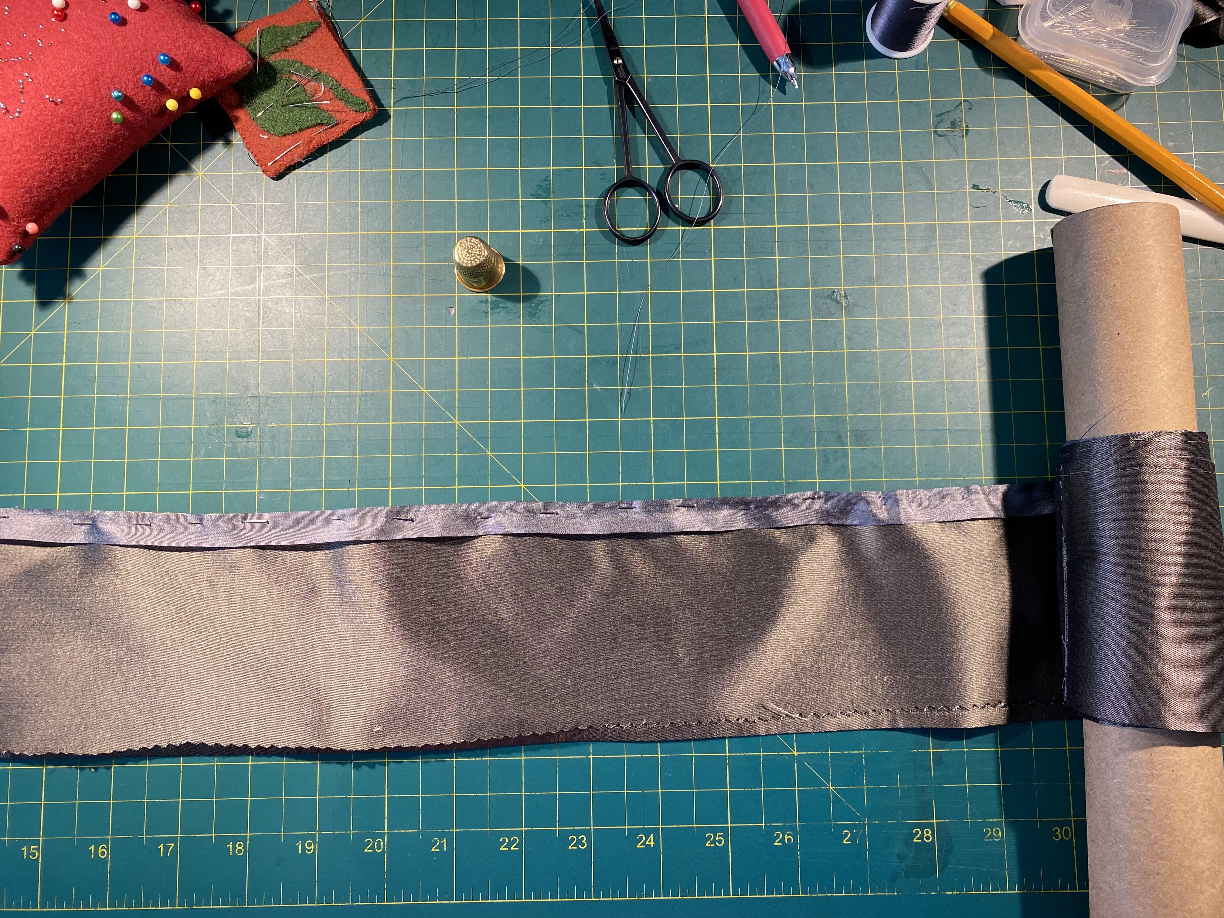 To manage the trim– there were yards and yards of it– I rolled it around empty toilet paper and paper towel tubes. Judge not, this made the wrangling easier. The ribbon was stitched on with silk thread using a running stitch, and the same stitch was used to attach it to the gown.