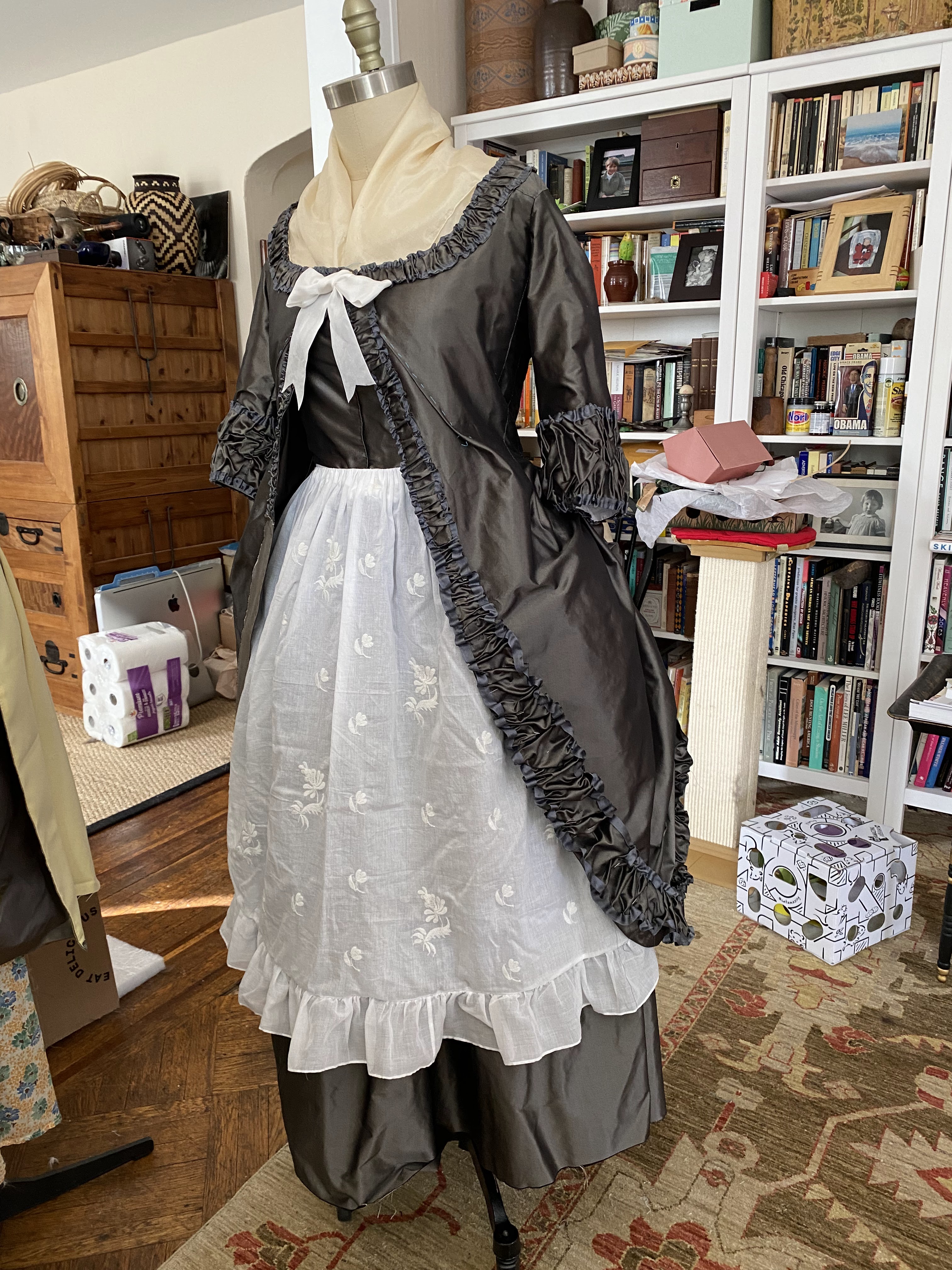 The sleeves were made from the shape I’d gotten in that last pre-pandemic workshop, so they were pretty easy. Setting them was another matter; fortunately, I had help. The construction from here on is standard 18th-century gown making, with a should strap piece and a binding piece for the back. Cutting the skirts seemed beyond me, so I diverted into a fancy apron.