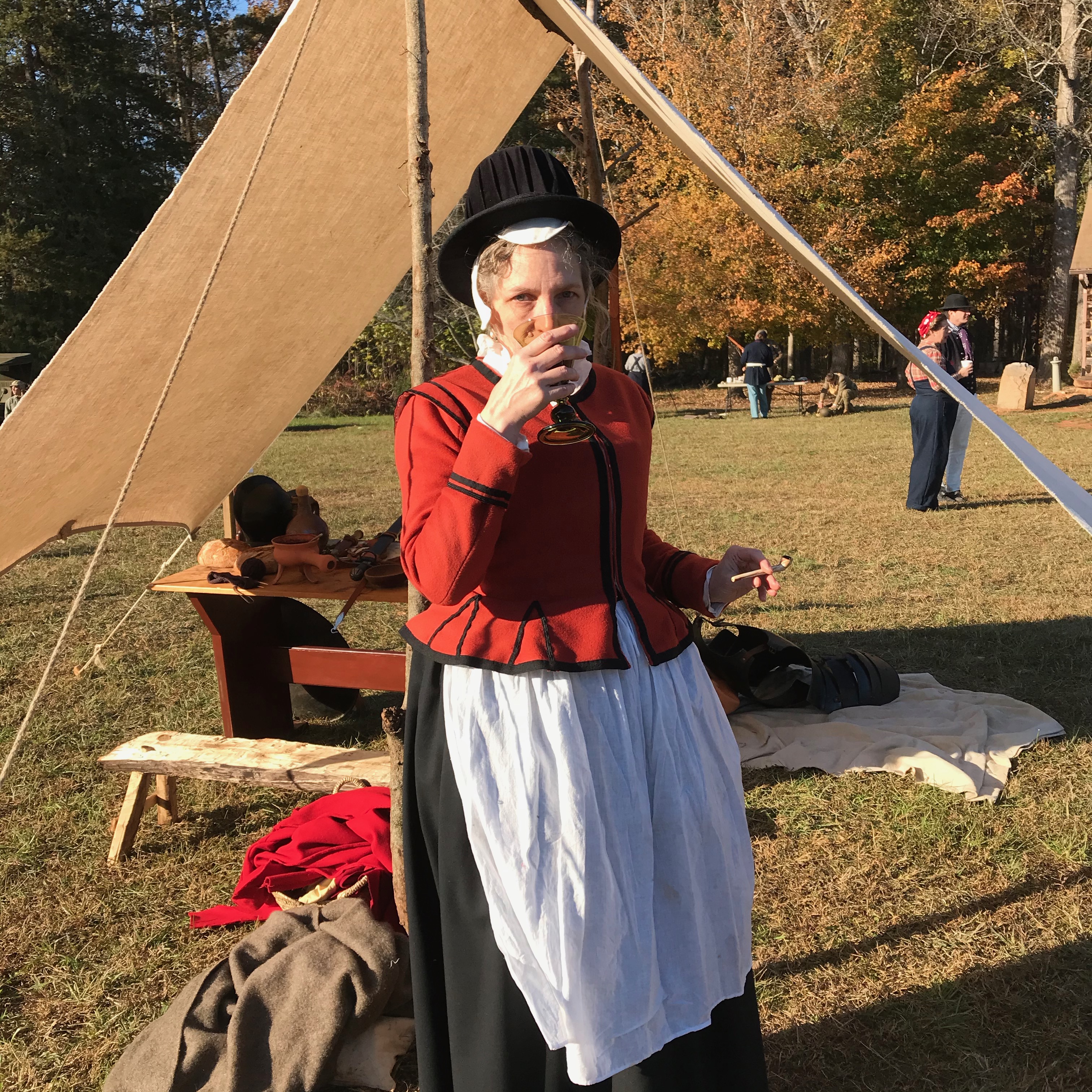 I accessorized the gown with a silk handkerchief, a cotton gauze cap, and silk mitts as well as the sprigged apron. The handkerchief is pinned closed with a fouled anchor stick pin, which, together with the cap trimming, emulate a Charles Willson Peale portrait at the Met. The hair is as high a roll as I can manage, over a homemade cushion, with hair extensions for fullness and buckles (side curls). High rolls and powdered hair were the very thing in 1777 Philadelphia, so I knew I had to manage it somehow. The Cadwaladers once purchased 12 pounds of hair powder from Ann Pearson’s sister Mary Symonds, so obviously, hair powder was required. While 12 pounds initially seemed excessive, by the time I’d done my hair twice, 12 pounds seemed like it could go pretty fast.