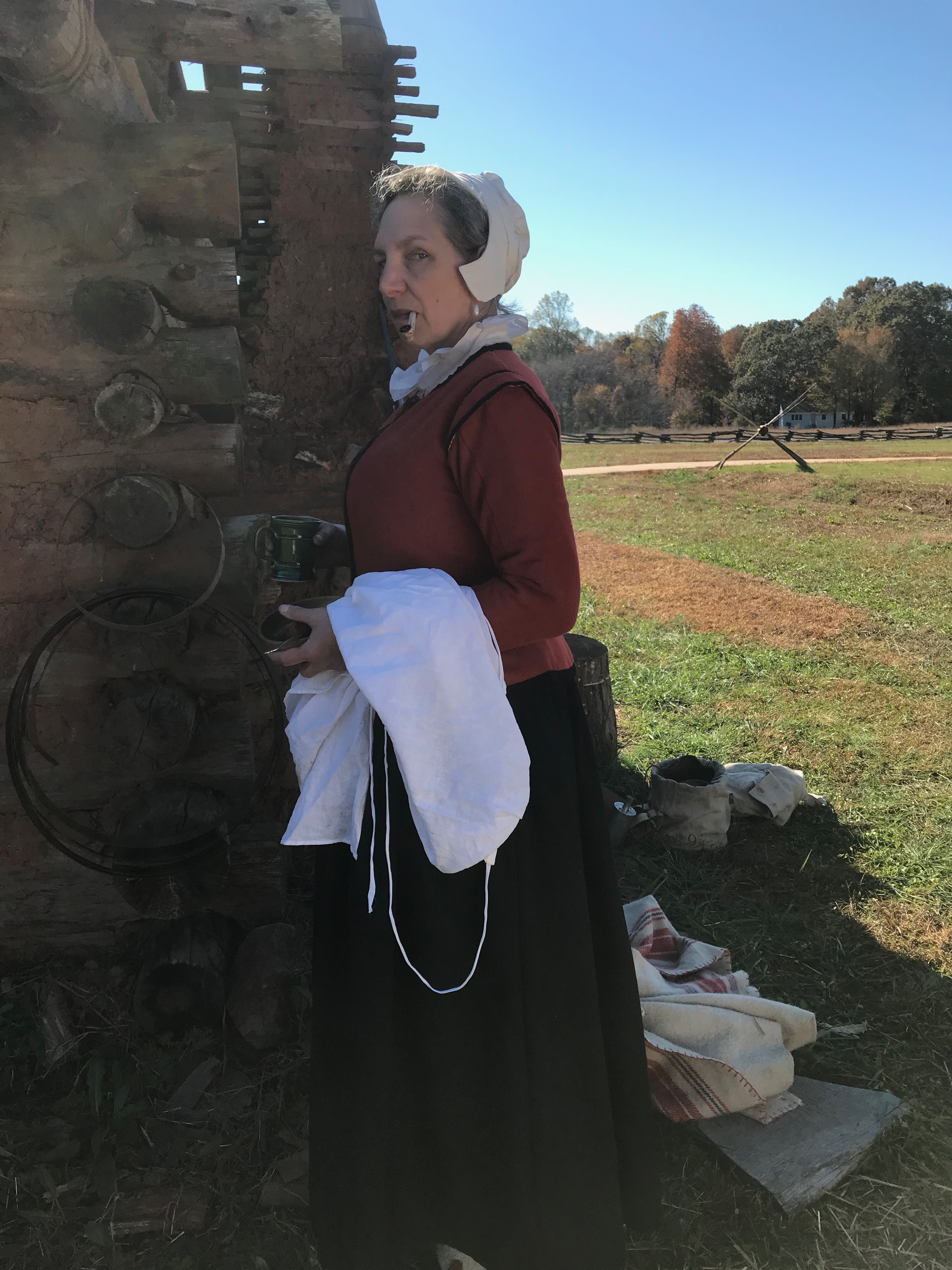 I imagined Ann Pearson Sparks projecting her currency in fashion trends by wearing this style while wearing an apron as she trimmed bonnets. That’s a fantasy as far as it goes since I have no immediate evidence of Ann’s clothing, only educated guesses based on readings in costume history and Philadelphia in the 1770s. The apron fabric is a reproduction from Burnley & Trowbridge, trimmed with a plain cotton lawn, also from B&T.
