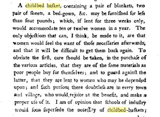 “Childbed baskets” were also a new concept to me, but The Female Reader, Or, Miscellaneous Pieces in Prose and Verse; Selected from the Best Writers, … for the Improvement of Young Women illuminated the term; the current equivalent is a layette set that includes bedding, and goes beyond the crocheted sweater, cap and booties some of us came to fear receiving. (Mint green acrylic? really?)