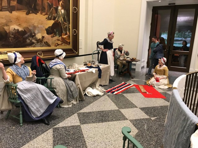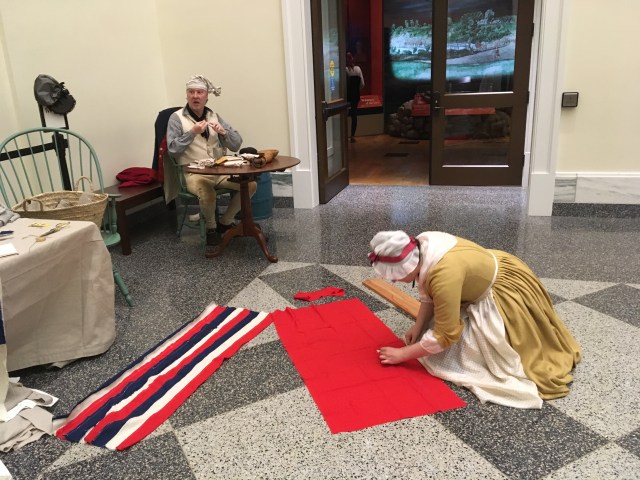 The biggest challenge in interpreting Rebecca Young and the shop she ran was not how flags were made (an appointment at the Cultural Resource Center of the National Museum of the American Indian answered that question*), but rather how to make sewing interesting, and how to create a more interactive experience for ourselves and for visitors. Some of my favorite living history experiences involve playing off other interpreters and the public, especially when trying to convince visitors to pick a side, carry a message, or share a secret. Saturday’s set up made that harder, with Rebecca’s shop of women behind a table (we wanted to be sure to be open to visitors, and not make the dreaded reenactor circle), and with Drunk Tailor rolling cartridges in a niche.