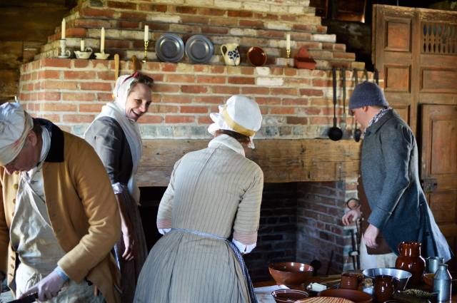 (I baked the pound cake at home, but the egg and onion pies were made on site. I lack historically correct baking apparatus aside from one pie plate.) Cooking in the cabin at Hancock House reminded me of good times long ago— and not so long ago–and how much I enjoyed throwing refuse out a window, and using a soapstone sink. The weekend also brought to mind “show, don’t tell” as it applies to interpretation, and made me think again about how to create more immersive educational experiences for visitors, without becoming ritualistic.