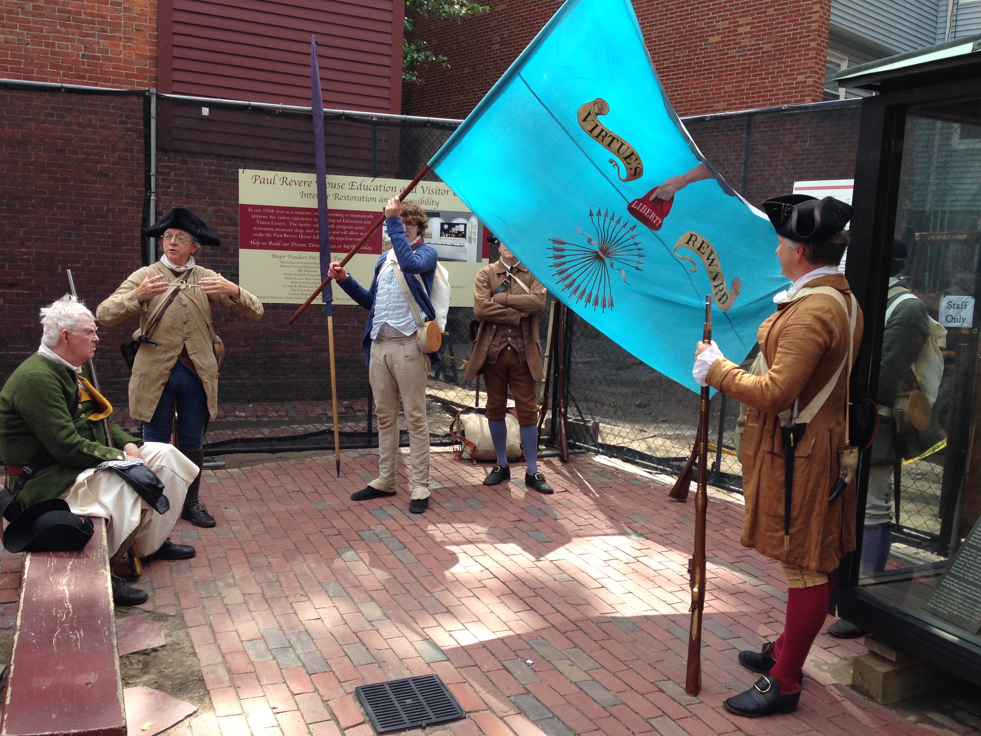 We got to Rowe’s Wharf in time for the national anthem– or, as we like to call it, The Anacreontic Song. There was much speechifying, and though we were not talking too much, water was required. Those pockets came in handy again, as did my own capacious pockets. Good thing, too: the line was long and the sun was hot. One woman offered to let us go ahead of her in line, but that seemed wrong: if you have to wait in line, you have to wait, and the rule we have absorbed is that the public comes before reenactors. But, since we’d been asked to come, we decided to check the situation, and went to inquire. The “bouncer” at the head of the line told us to come back later, so we decided it was time for some lunch.
