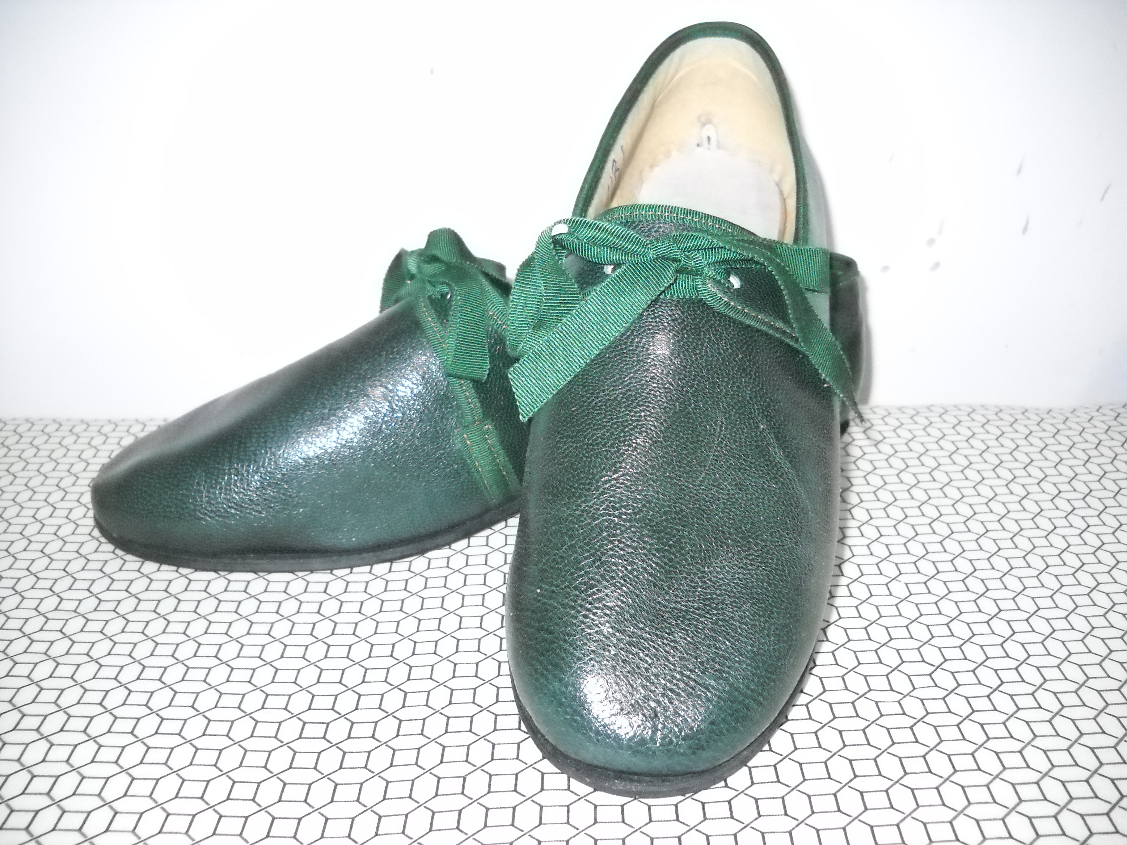Burnley & Trowbridge shoes also run narrow, and their men’s mules work for me, because I like a very low, flat heel. In winter, wool stockings make up any size differential, and in summer, these flats are pretty comfortable and even walkable. They may not be perfectly correct (though documented here), but comfort plus documentation goes a long way in my book.