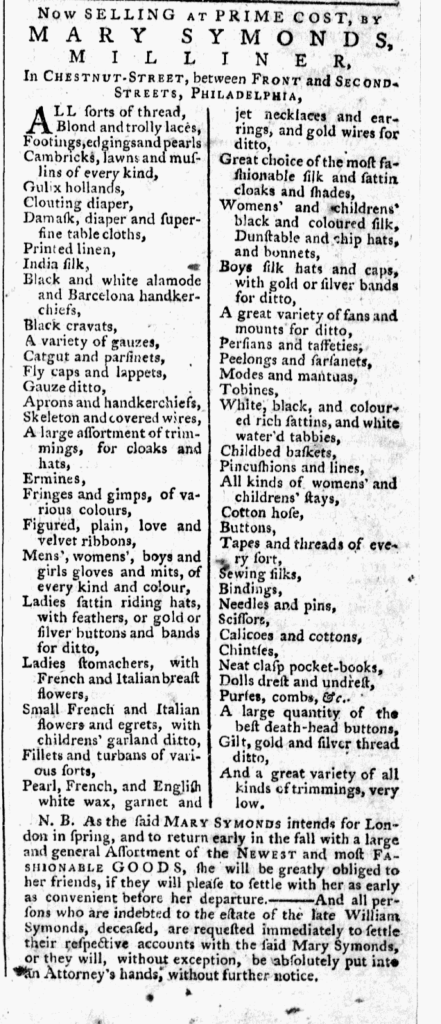 Among the things I ponder about Anne Pearson Sparks is what she wore, and how much clothing she had. She would have seen the latest fashions and fabrics when she traveled to England to buy millinery goods. How did she translate those styles for her Philadelphia customers, like Mrs. Cadwalader, and how did she interpret them for herself? It’s largely unknowable since there are no known images of Anne. Probate inventories provide insights into the quantity and type of clothing women had in the 1770s. They skew higher income since people without wealth had so much less to leave, but given that Anne Pearson owned her own house, and had a £2700 marriage settlement, she certainly had means.