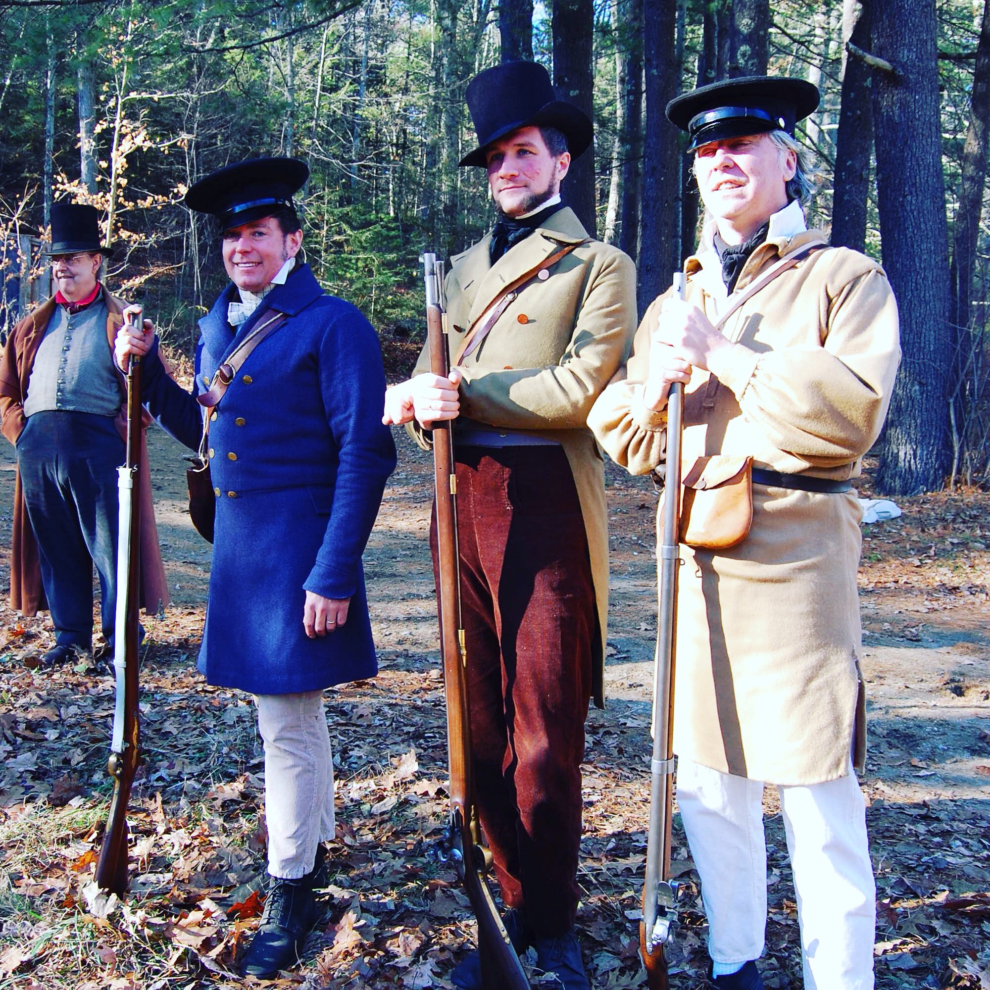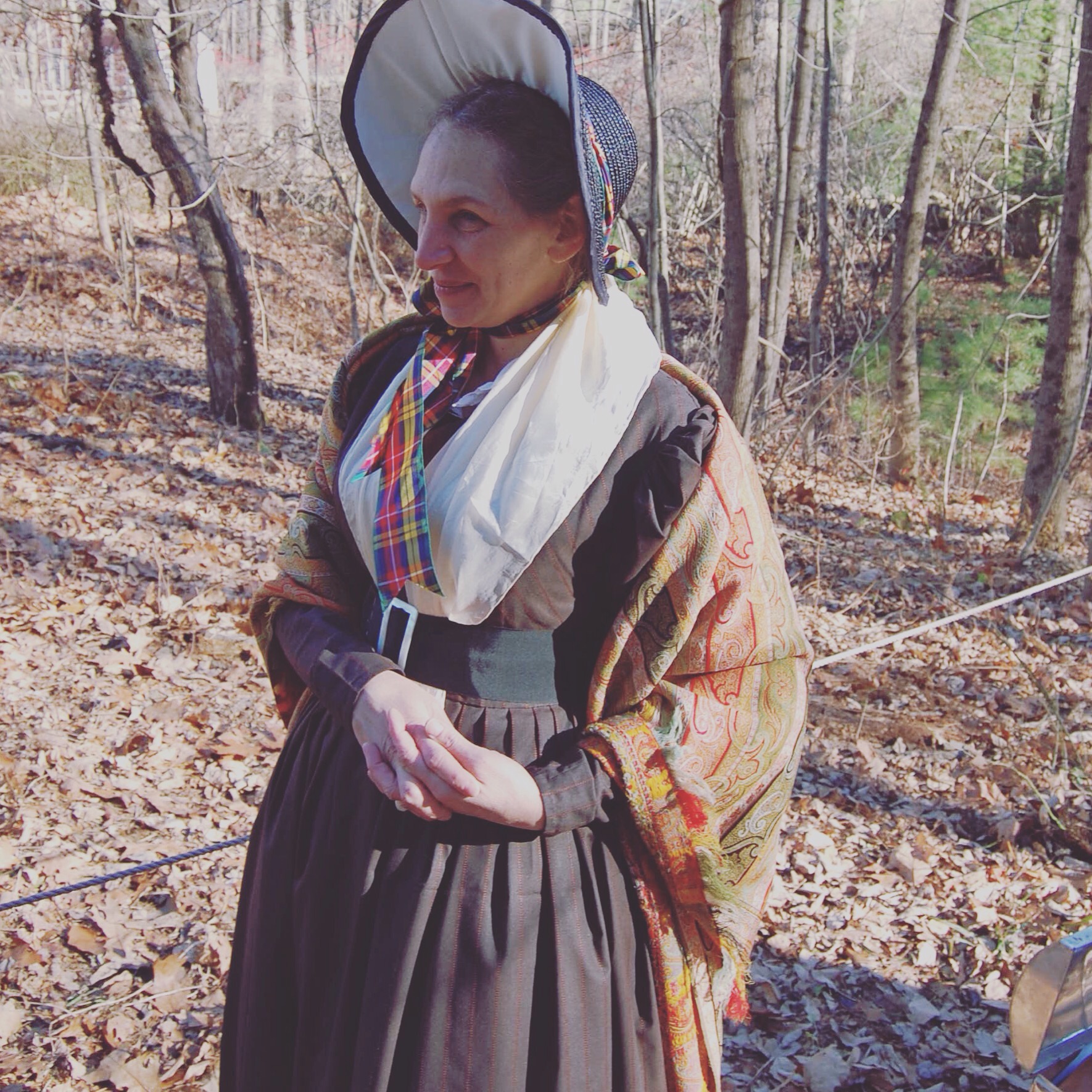 I had planned to wear this with the blue cotton skirt and a riding shirt or habit shirt, but I miscalculated the neck opening and ended up without enough time to restart, so I borrowed a shirt from Mr. K. Luckily the sleeve plumper fit over the shirt, and the jacket fit over all of it! The weather was lovely for early September in New England, and I spent a pleasant day talking about women’s sportswear and the rising interest in physical culture as part of a well-rounded and healthy education in the early 19th century.