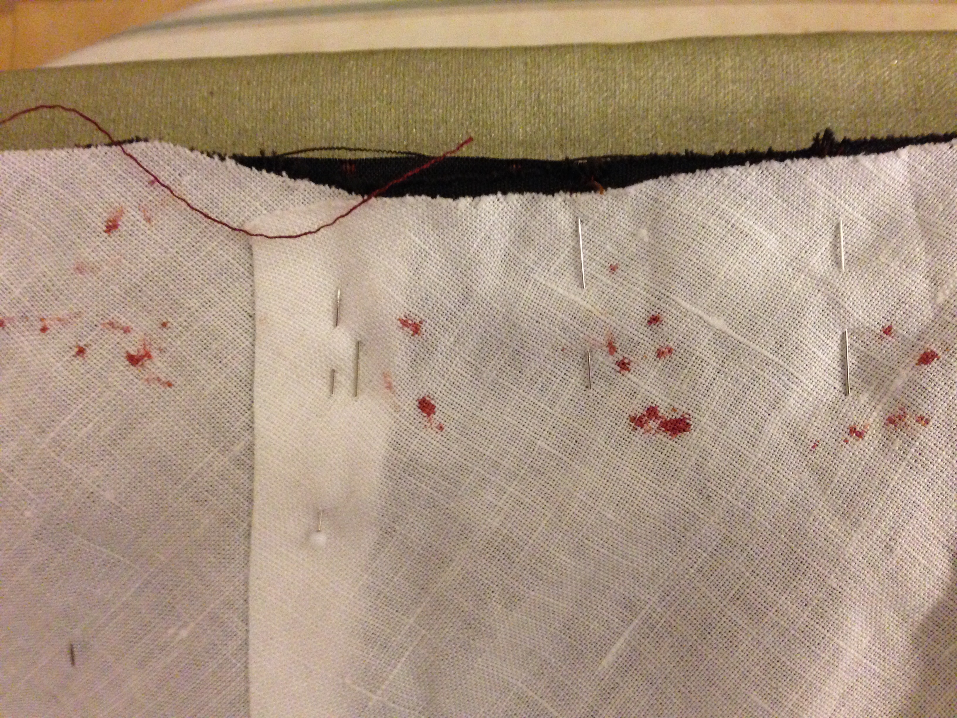 The construction is straightforward, and much like a gown from the period. The bodice is lined, while the sleeves are not. I took advantage of the smaller piece sizes to use up some linen cabbage, and got myself a flashy mis-matched lining as a bonus. One of the trickiest parts was figuring out sleeve supports. I had a melt down over the cage supports, which showed through the lightweight linen and looked awful. I tried them first because I was concerned about the heat down- or wool-filled sleeve puffs would generate for an Labor Day weekend event. In the end, I remembered that I had cotton organdy, and that crumpled up to a nice volume inside some polished cotton covers. These are made with twill tape to attach them to stay straps, if you’re wearing them under a gown; the straps slip over your arms and the puffs rest more or less on your biceps.